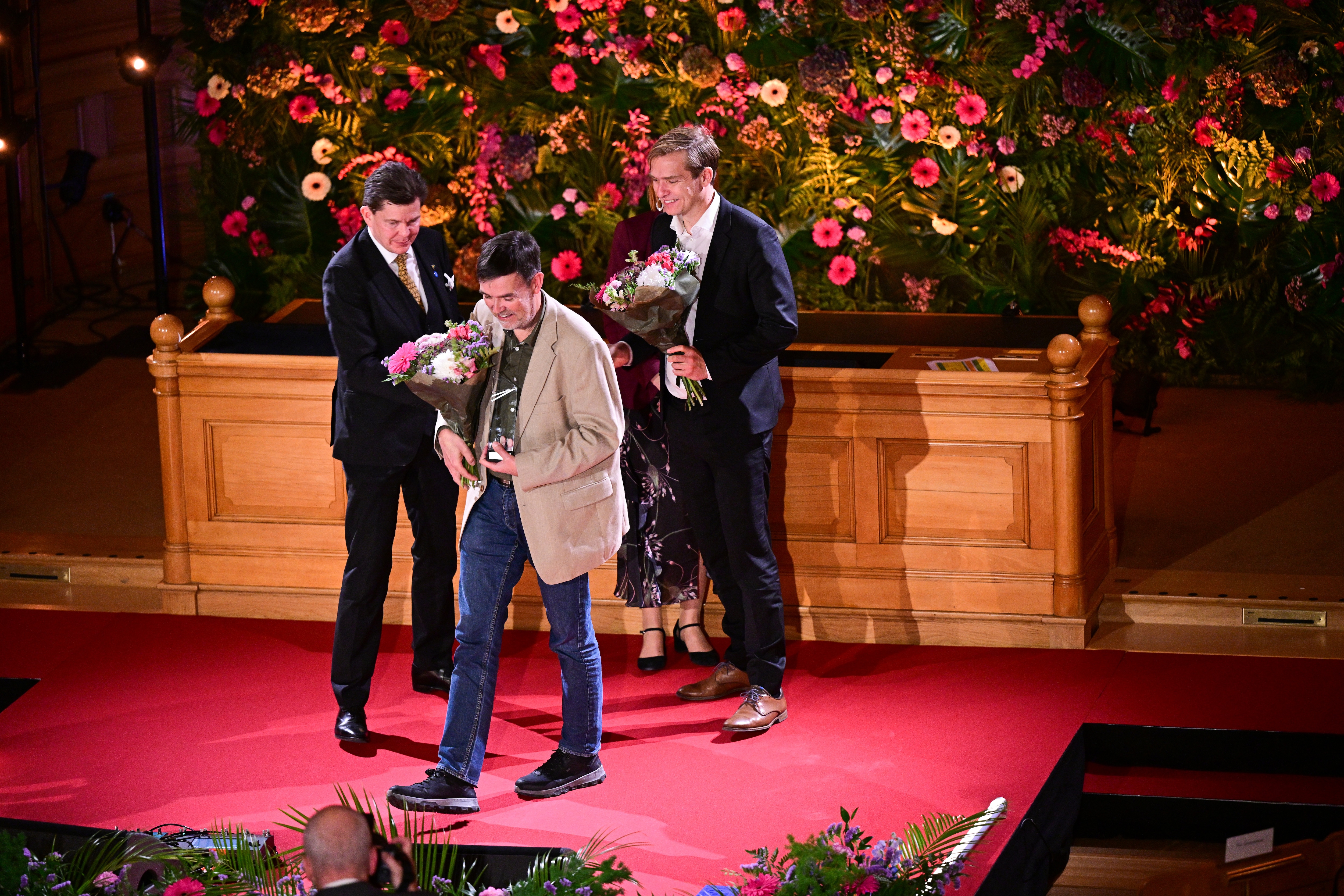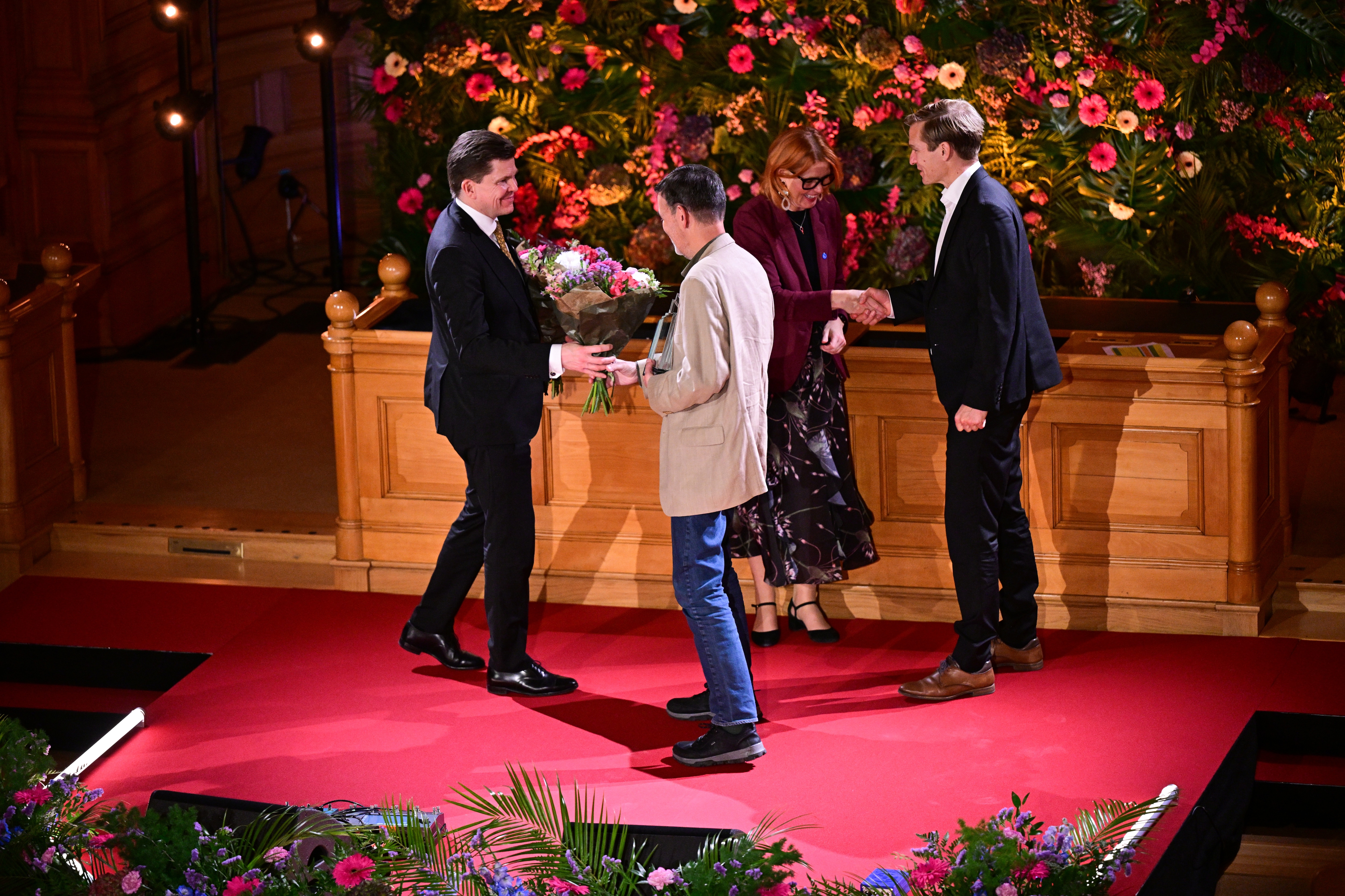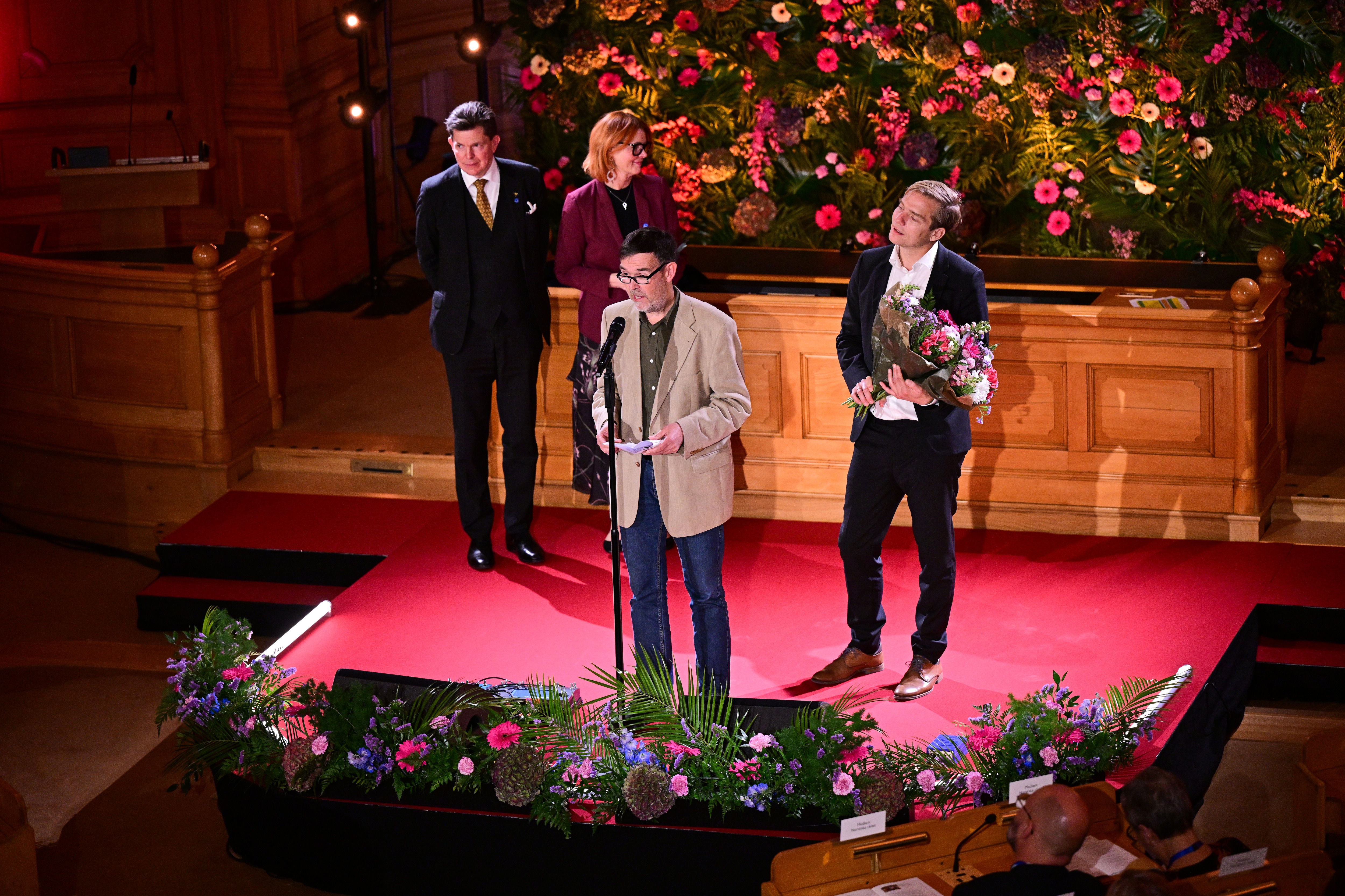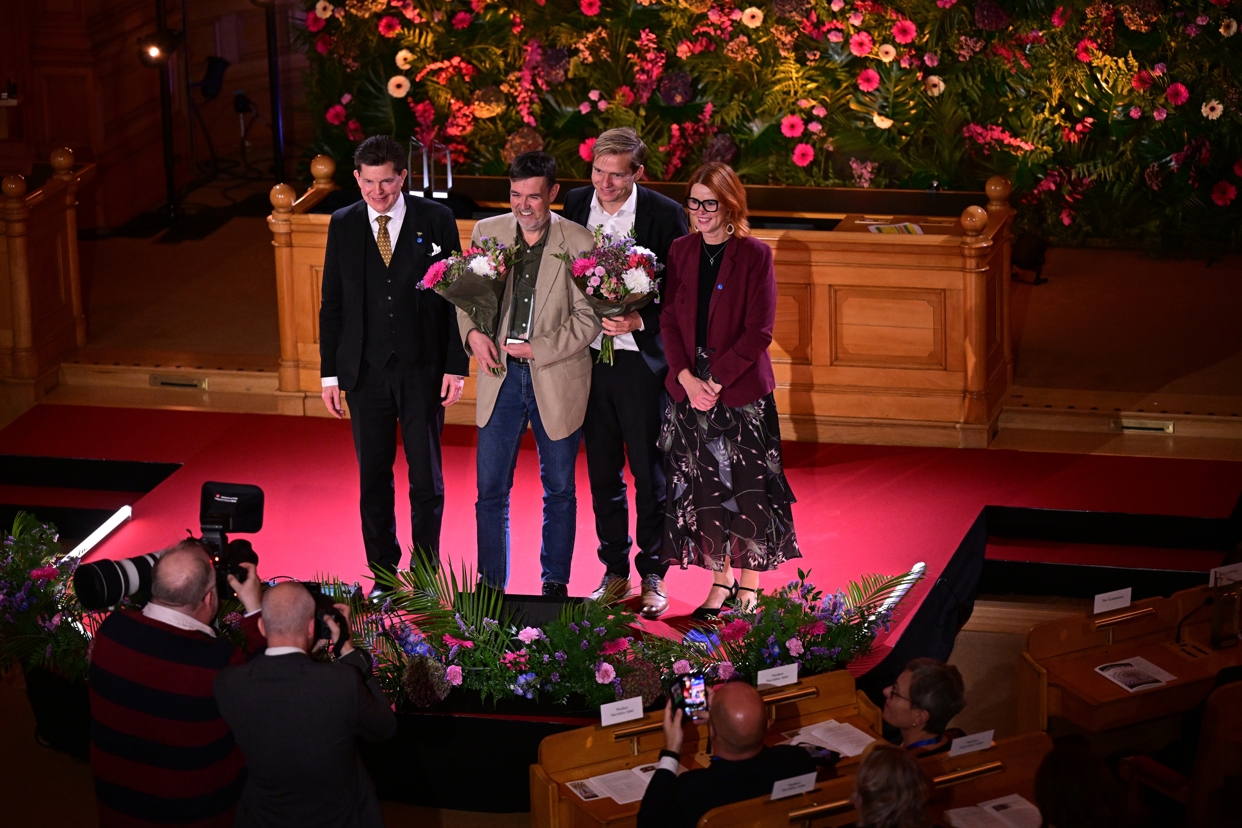 STOCKHOLM, SVERIGE 20251028 Nordiska rådets miljöpris, i år med temat "Civilsamhällets gröna bidrag", går till Danmarks Grønne Nabofællesskaber, som tas emot av Bent Mariager och Rune Baastrup. Priset delas ut av Sveriges riksdags talman Andreas Norlén och Nordiska rådets president Heléne Björklund under utdelningen av Nordiska rådets priser inom litteratur, barn- och ungdomslitteratur, film, musik och miljö, i Andrakammarsalen i riksdagen. Foto: Magnus Lejhall / TT / Kod 10658. (Foto: © Magnus Lejhall, TT/Ritzau Scanpix)