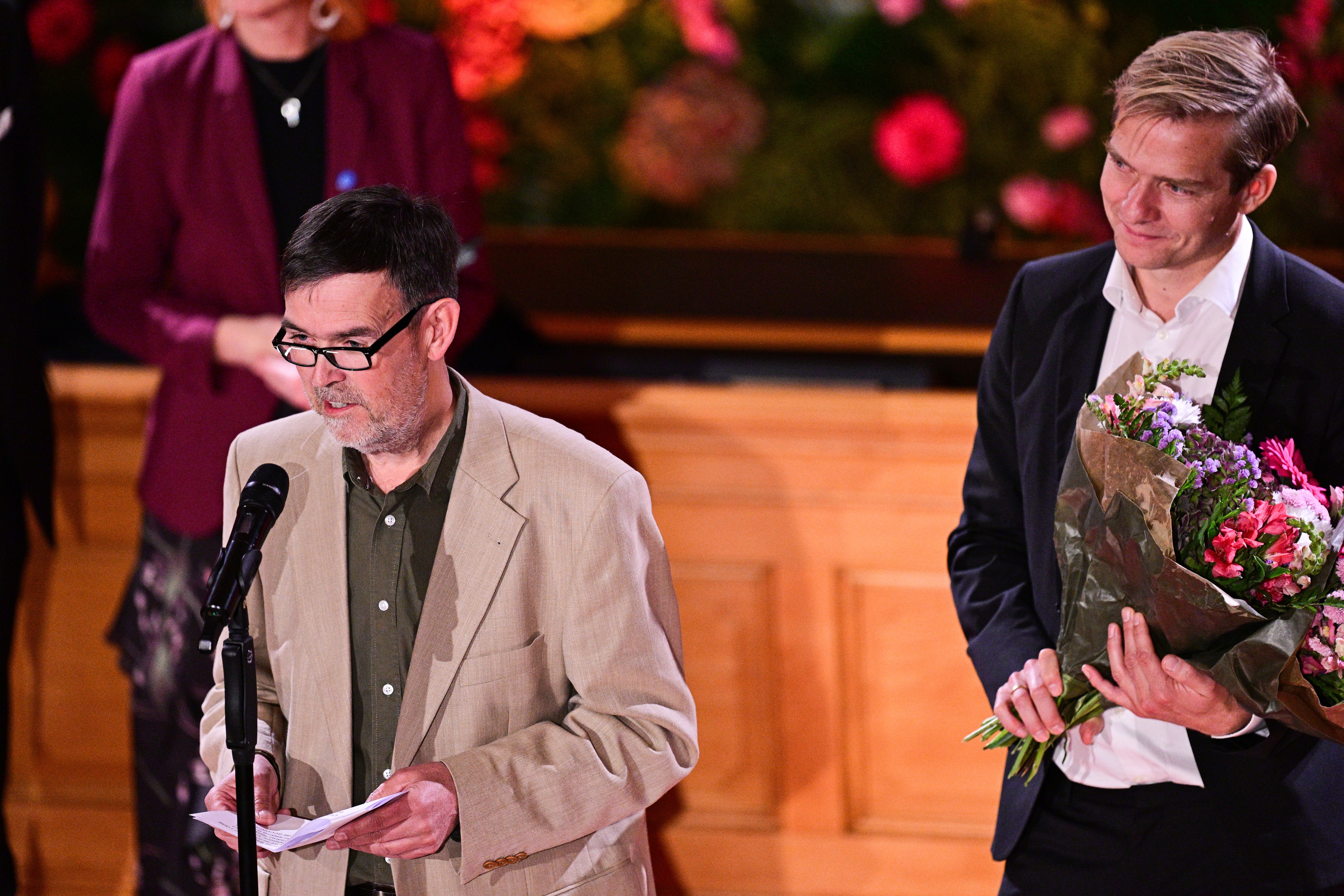 STOCKHOLM, SVERIGE 20251028 Nordiska rådets miljöpris, i år med temat "Civilsamhällets gröna bidrag", går till Danmarks Grønne Nabofællesskaber, som tas emot av Bent Mariager och Rune Baastrup under utdelningen av Nordiska rådets priser inom litteratur, barn- och ungdomslitteratur, film, musik och miljö, i Andrakammarsalen i riksdagen. Foto: Magnus Lejhall / TT / Kod 10658. (Foto: © Magnus Lejhall, TT/Ritzau Scanpix)