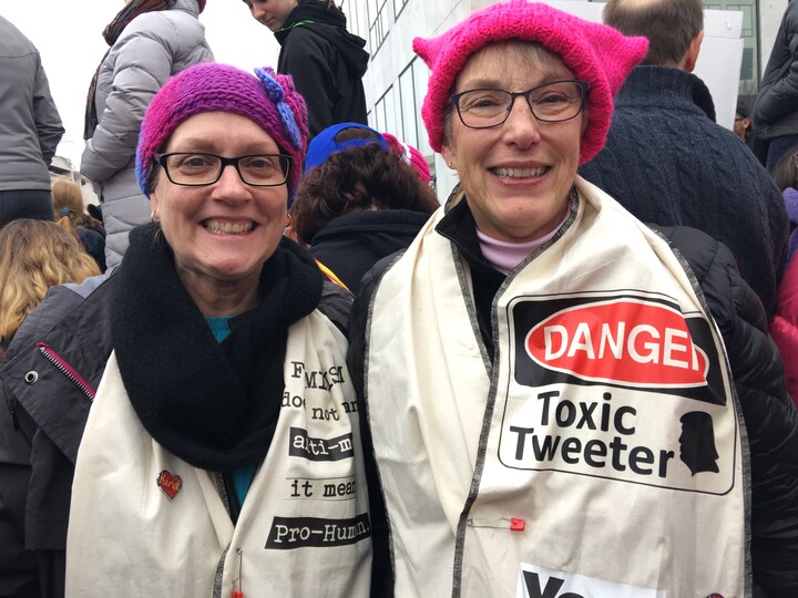 Billeder fra protesterne i Washington D.C., der lige nu strømmer ud på de sociale medier, viser tusinder og atter tusinder af lyserøde huer, parykker og hatte i march på vej mod Kongressen.