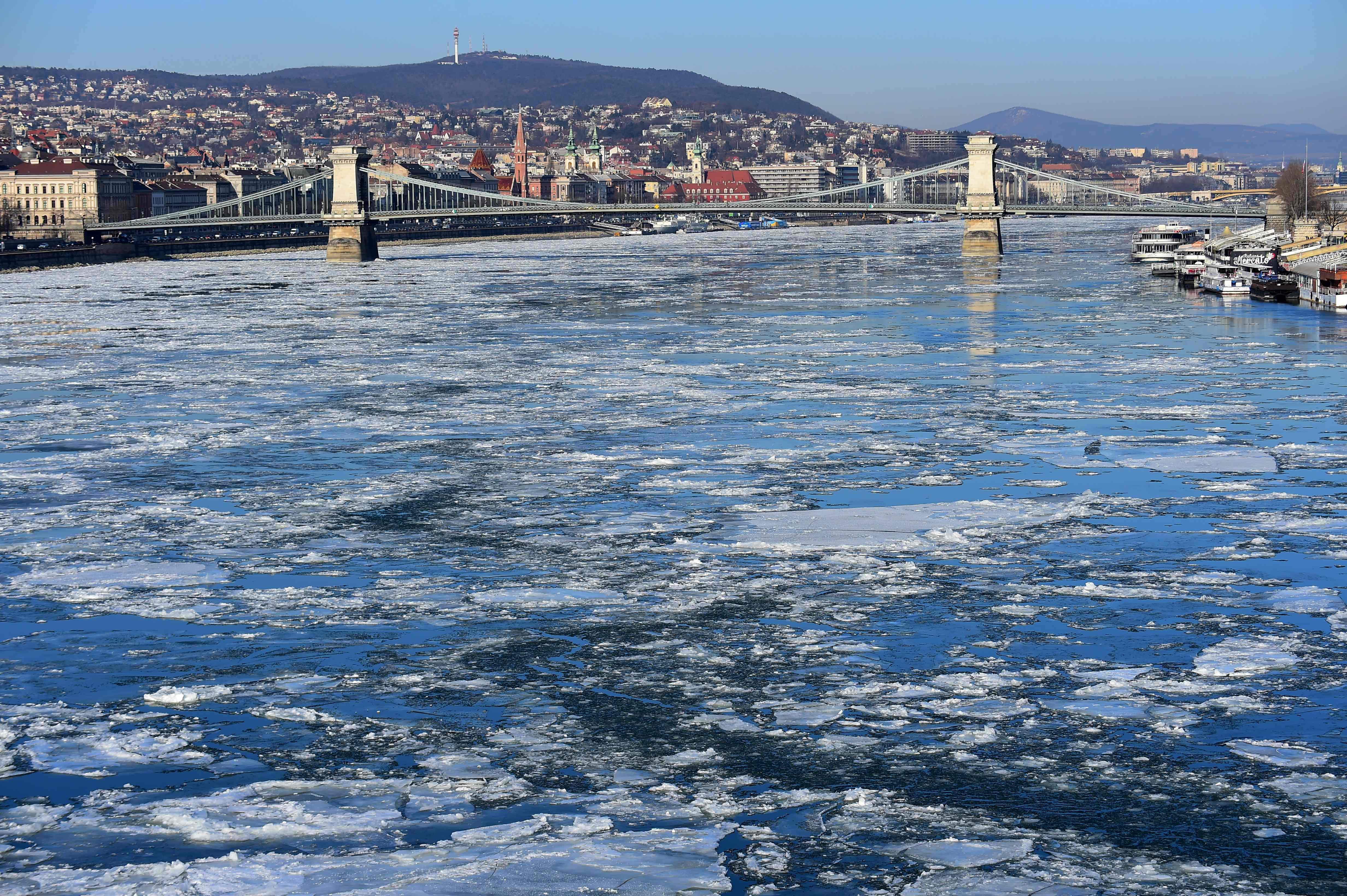 Donau-floden i Budpest er frosset til is henover de seneste døgn. (Foto: © Balazs Mohai, (c) DR/Scanpix)
