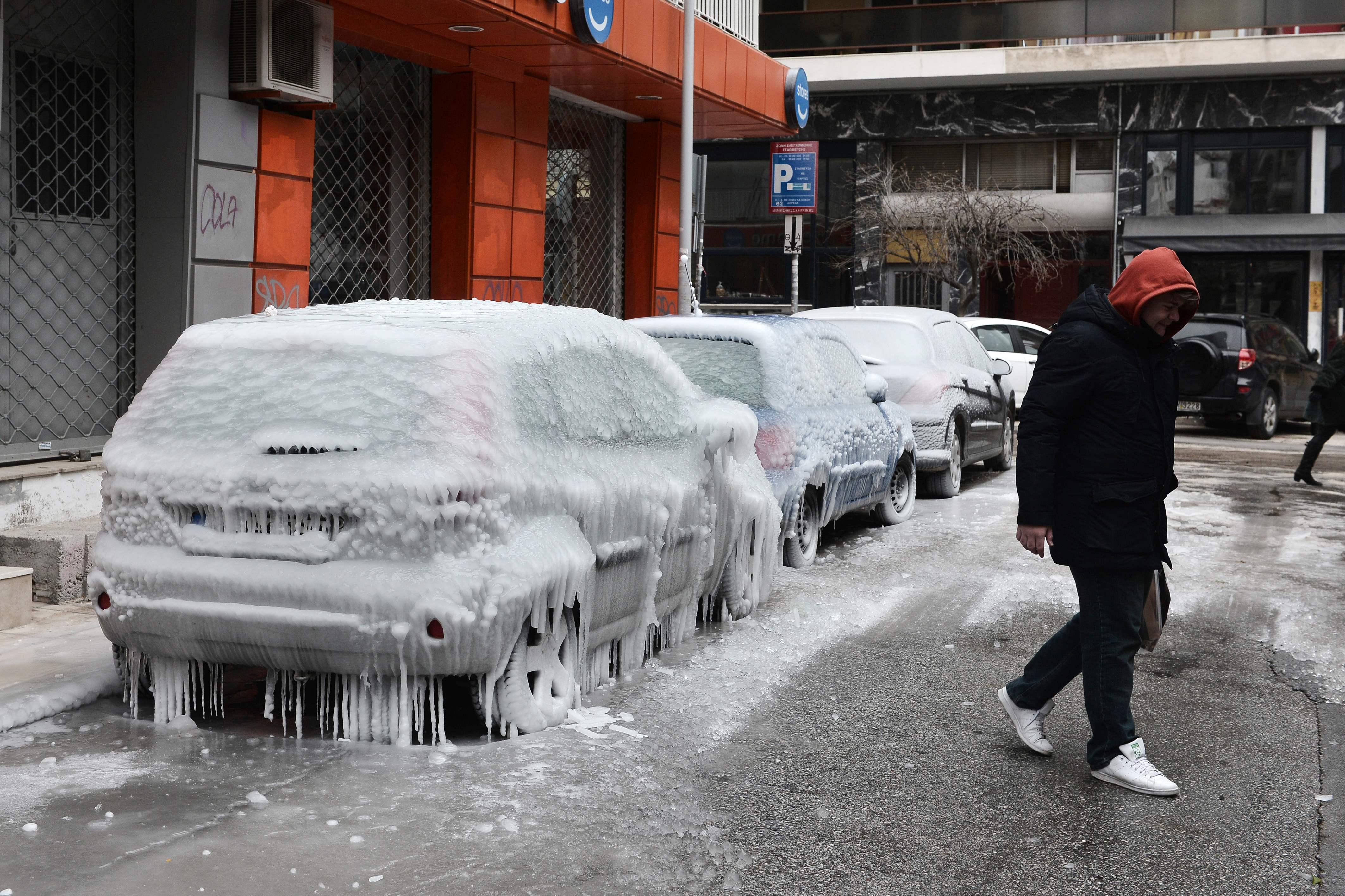 I Thessaloniki i Grækenland er biler frosset fast til gaderne, og flere skoler har aflyst undervisningen på grund af det ekstreme vejr. (Foto: © SAKIS MITROLIDIS, AFP or licensors)