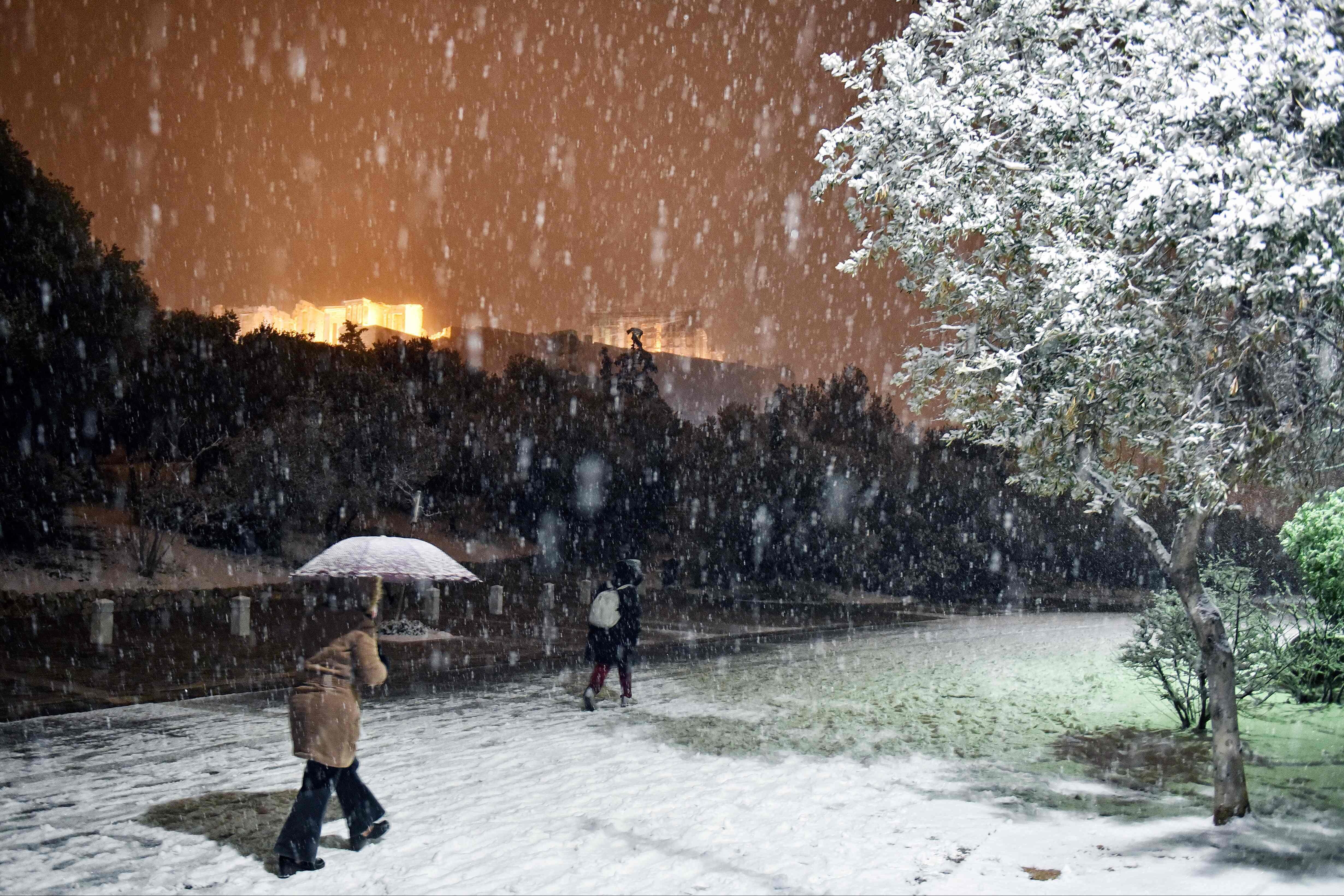 En kvinde skærmer sig for nyfalden sne tæt på Akropolis i Athen. (Foto: © LOUISA GOULIAMAKI, AFP or licensors)