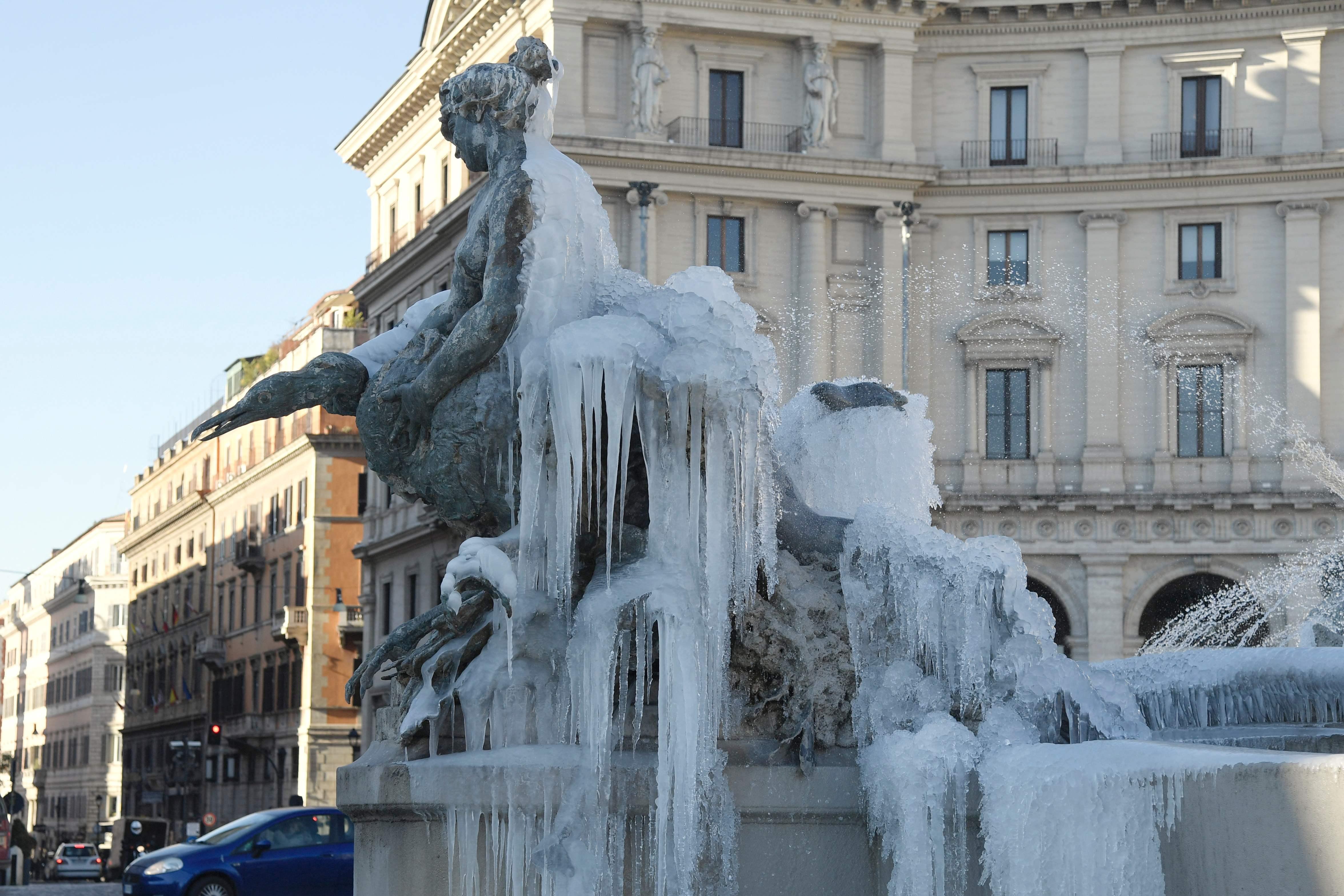 Springvandet Naiadas ved Piazza della Repubblica i Rom er frosset til is i de kolde minusgrader. (Foto: © Tiziana Fabi, AFP or licensors)