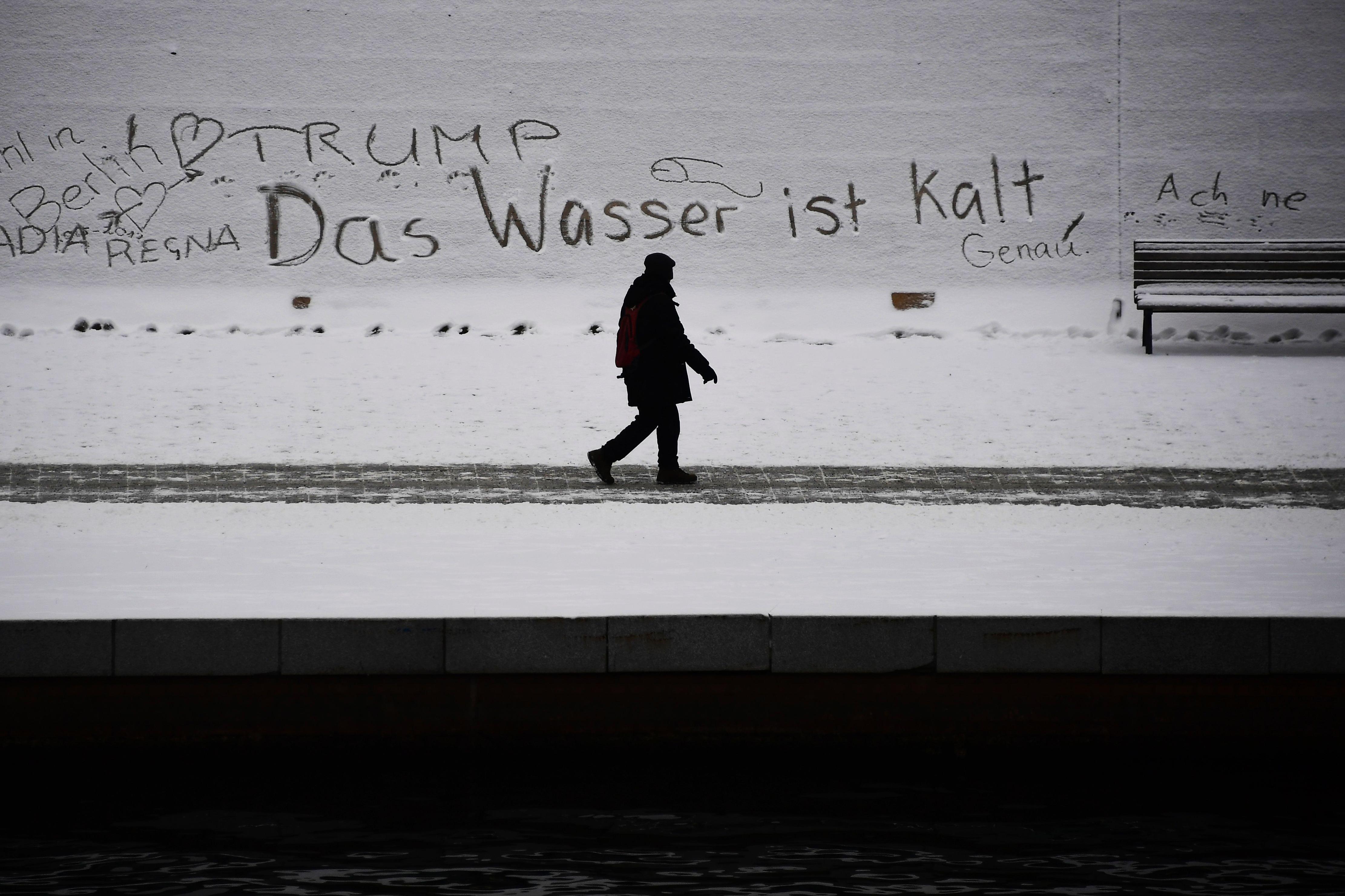 "Vandet er koldt. Præcis" står der skrevet på væggen her ved floden Spree midt i Berlin. (Foto: © TOBIAS SCHWARZ, AFP or licensors)