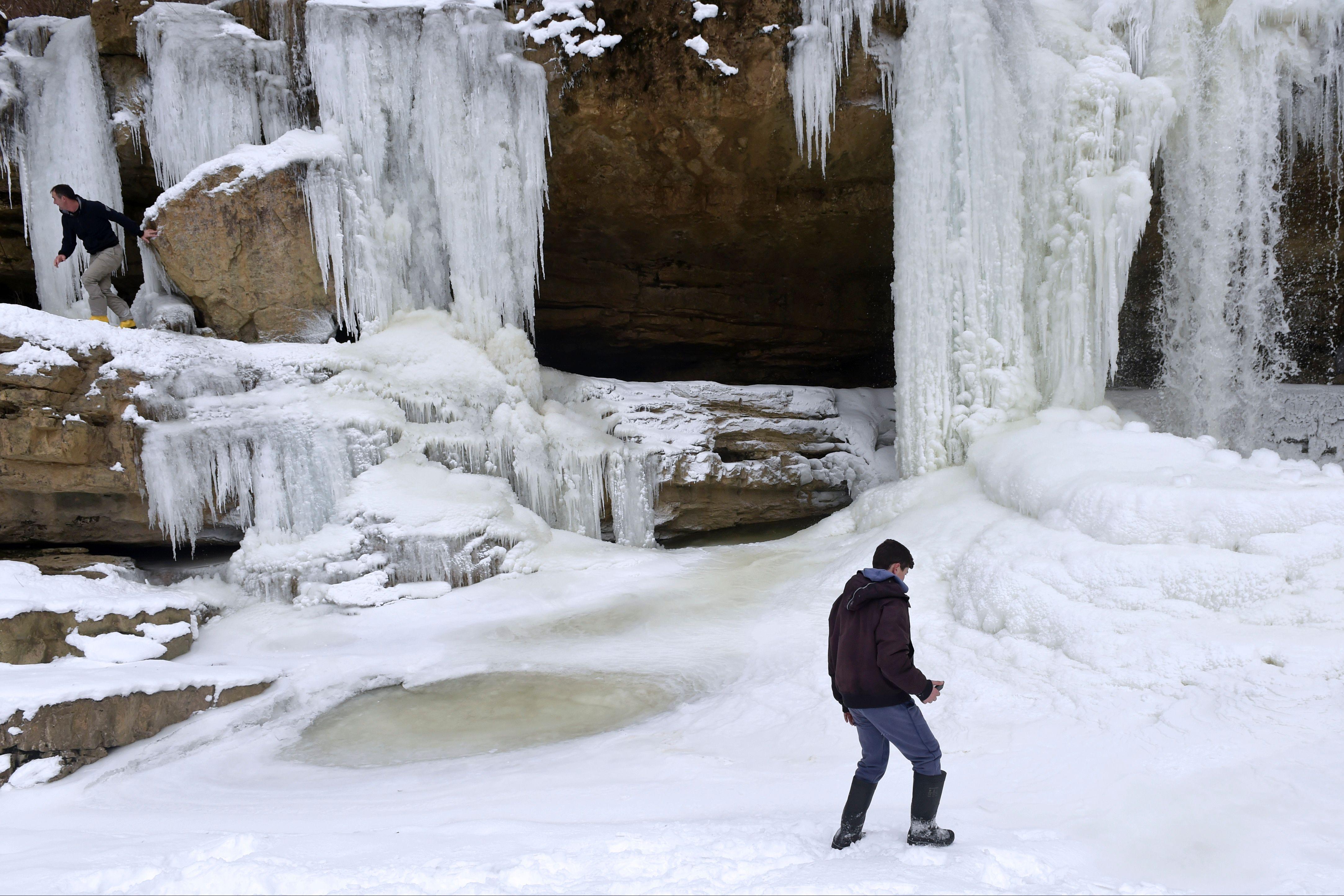 I Kosovo har det kolde vejr også fået fat i dette vandfald, der gør det muligt for børnene her at glide rundt på det frosne vand. (Foto: © ARMEND NIMANI, AFP or licensors)
