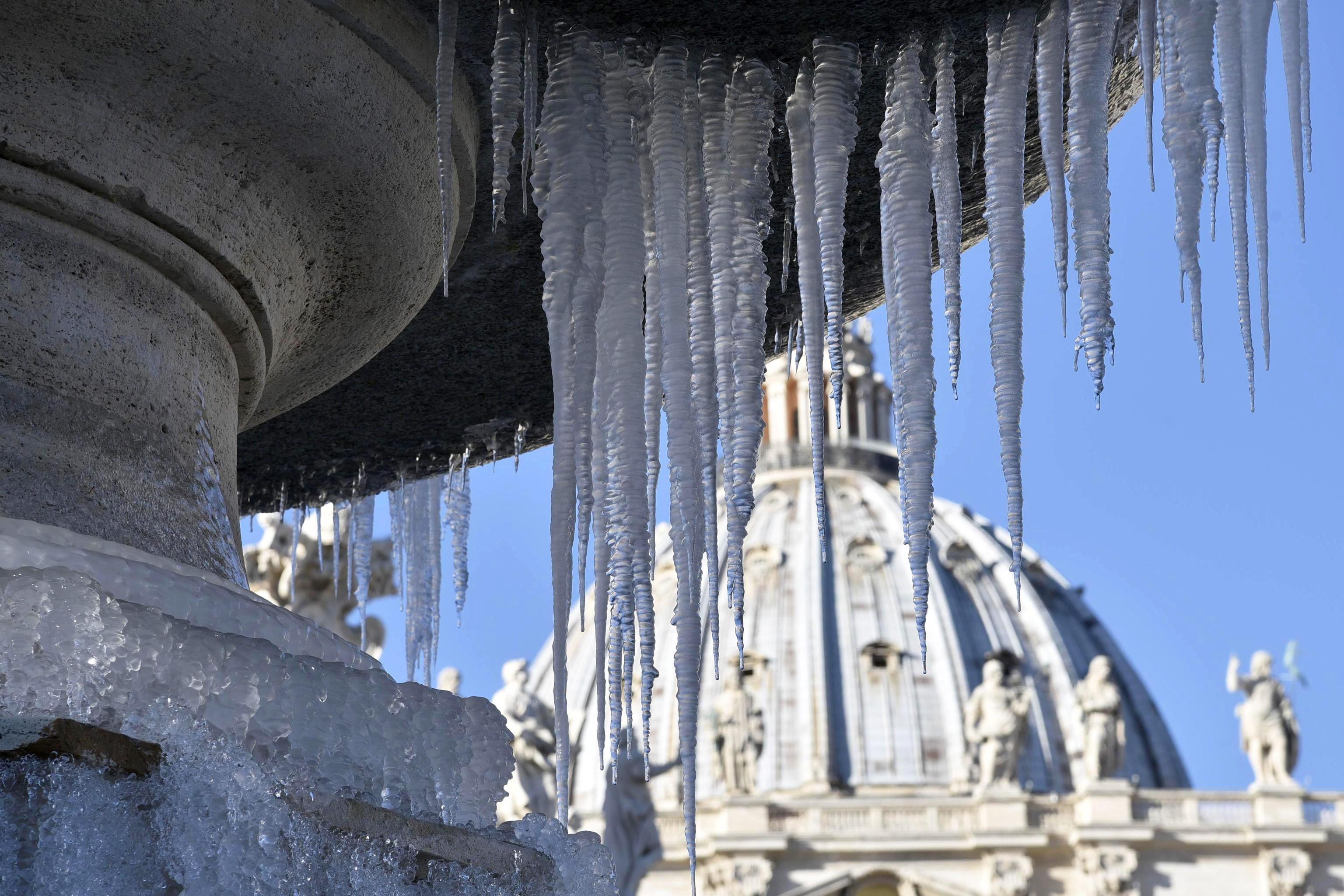 Pave Frans bad søndag en bøn for de mange hjemløse, som er særligt udsatte i kulden. Her ses et springvand i på Peterspladsen i Vatikanet, der også er blevet ramt af det iskolde vejr. (Foto: © Giorgio Onorati, (c) DR/Scanpix)