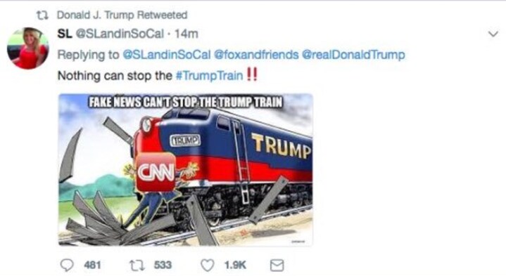 "Intet kan stoppe Trump-toget", og så et tog, der kører ind i en mand med et CNN-logo på hovedet.