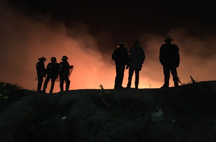 Mange hundrede indbyggere strømmede efter midnat ud af lejren med kufferter og andre ejendele, mens politiet gennede folk væk fra ilden på grund af fare for eksplosion af gasflasker.