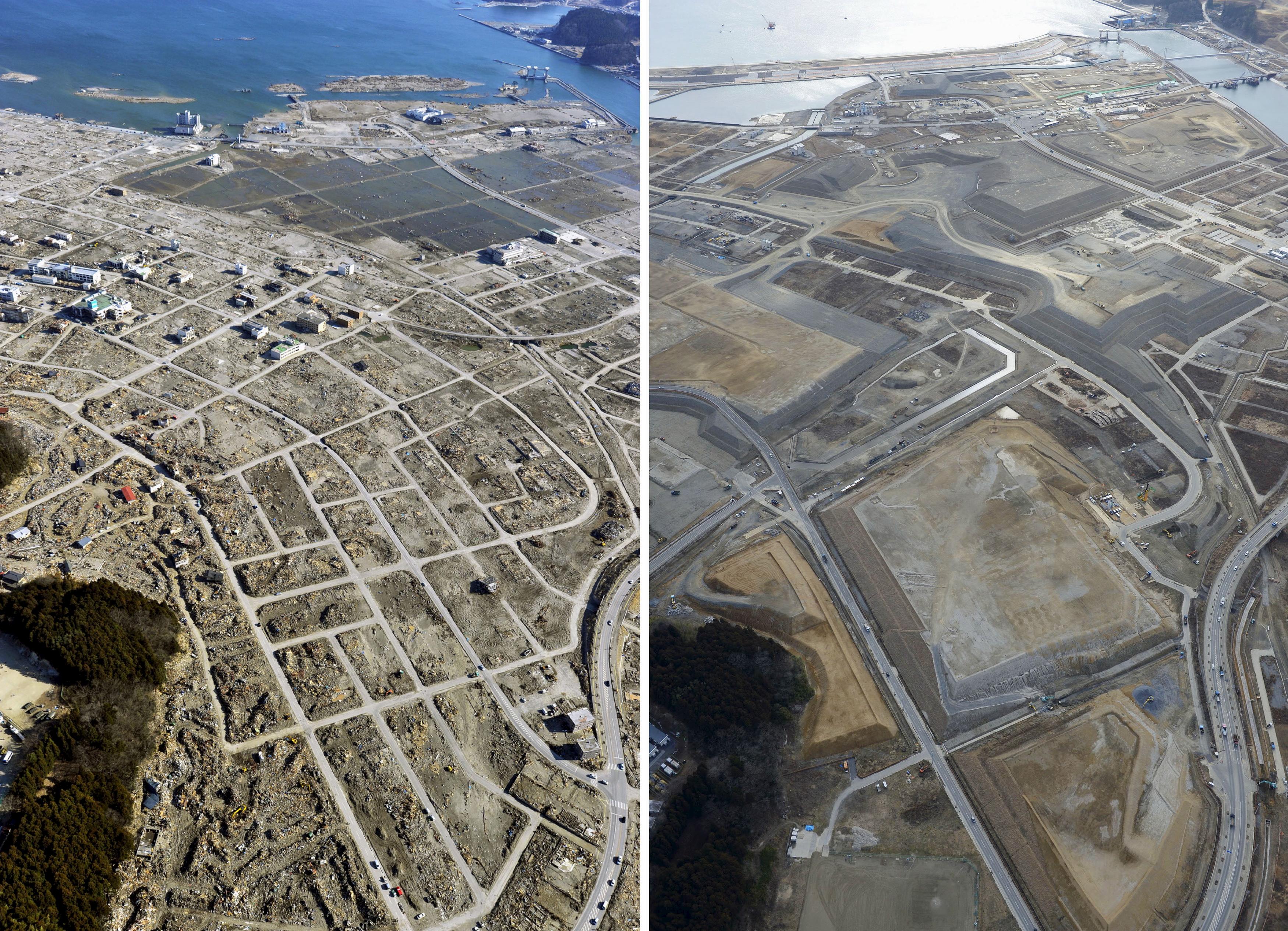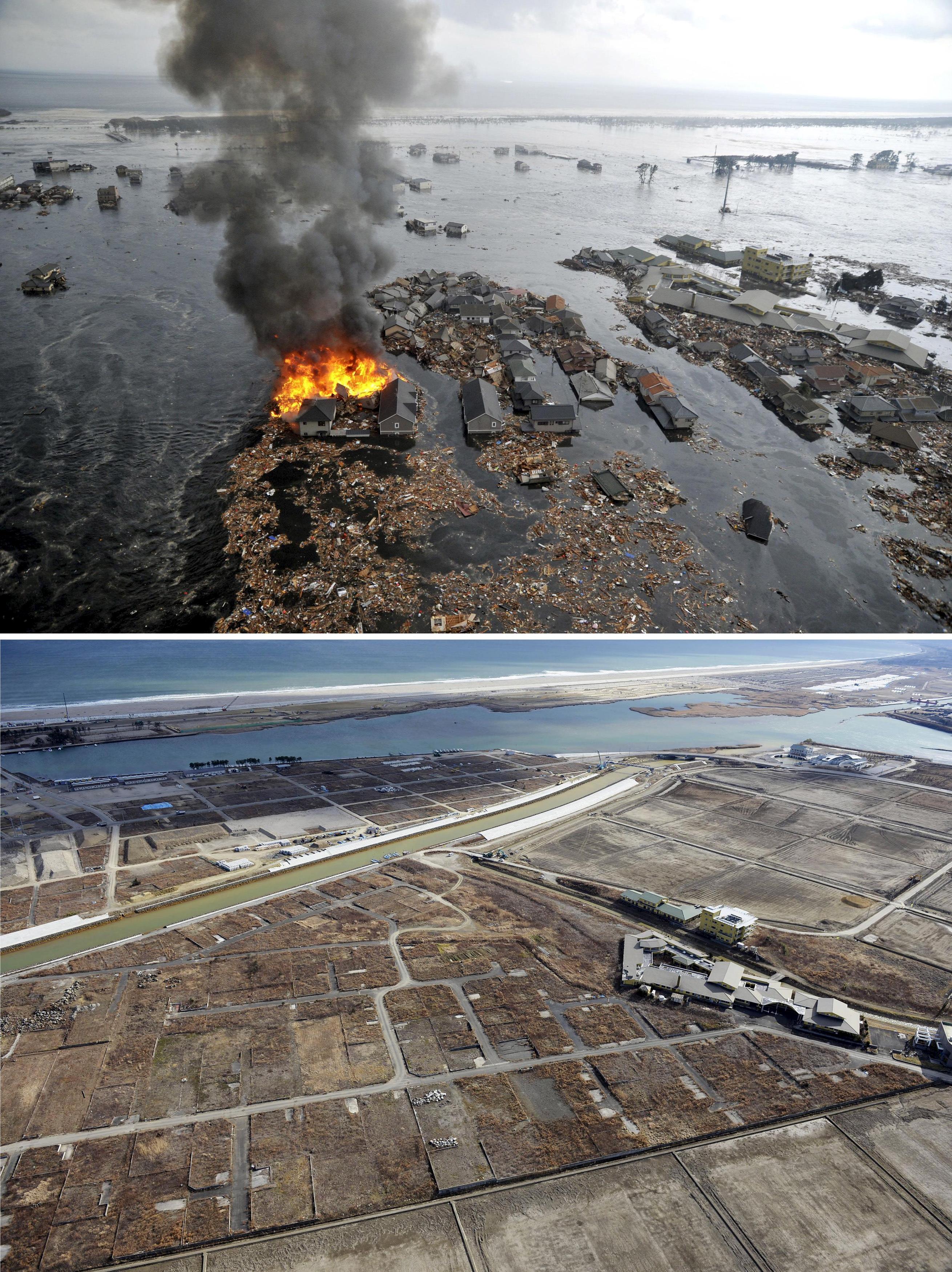 Efter jordskælvet fulgte en tsunami, der rejste sig ti meter over havets overflade. Den skyllede ind over Japans nordøstlige kyst tre timer efter jordskælvet.