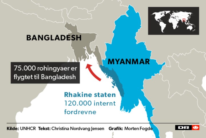 Krisen har drevet mindst 75.000 rohingyaer på flugt til nabolandet Bangladesh, og der er omkring 120.000 internt fordrevne i landet, ifølge UNHCR.