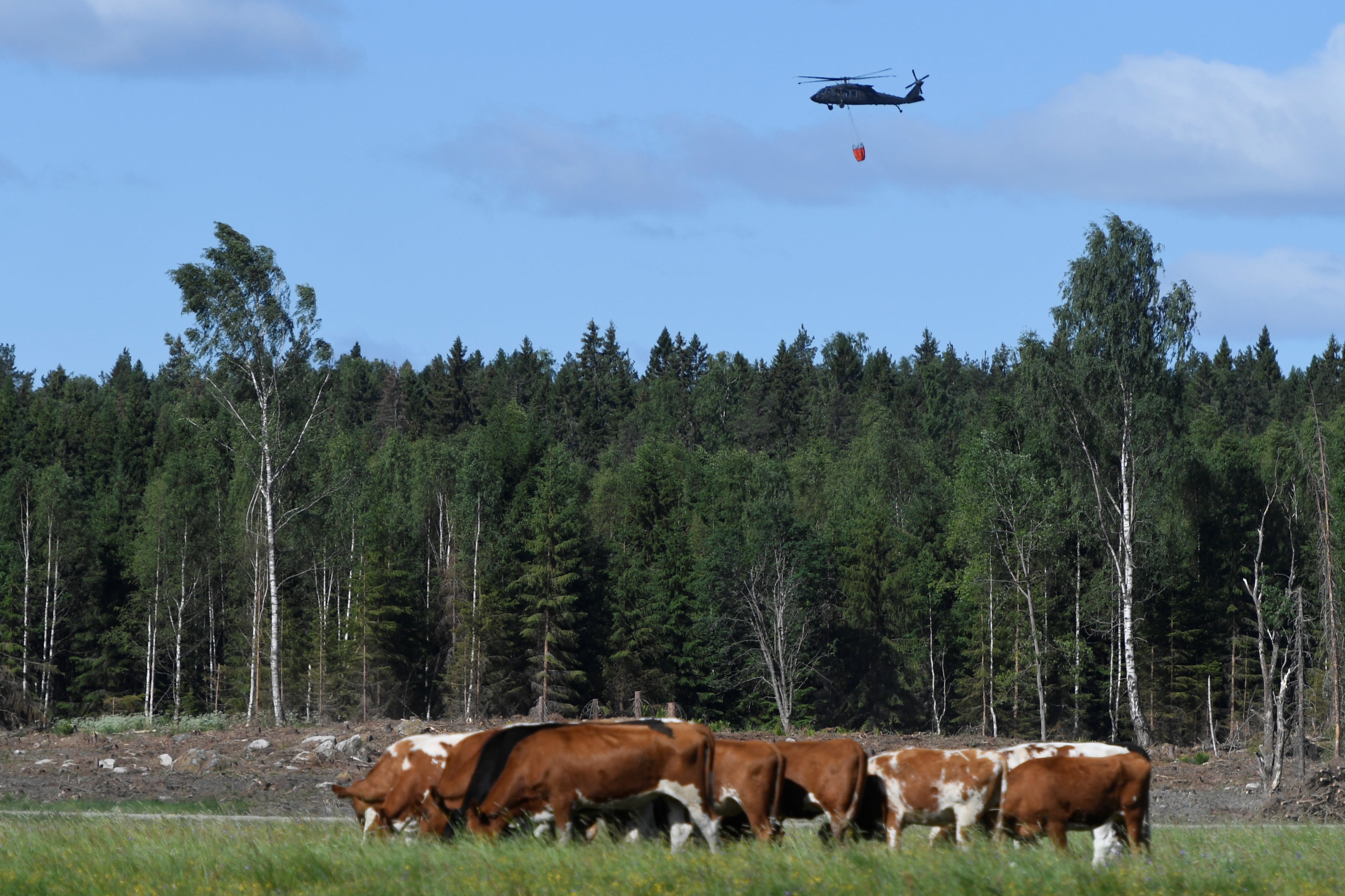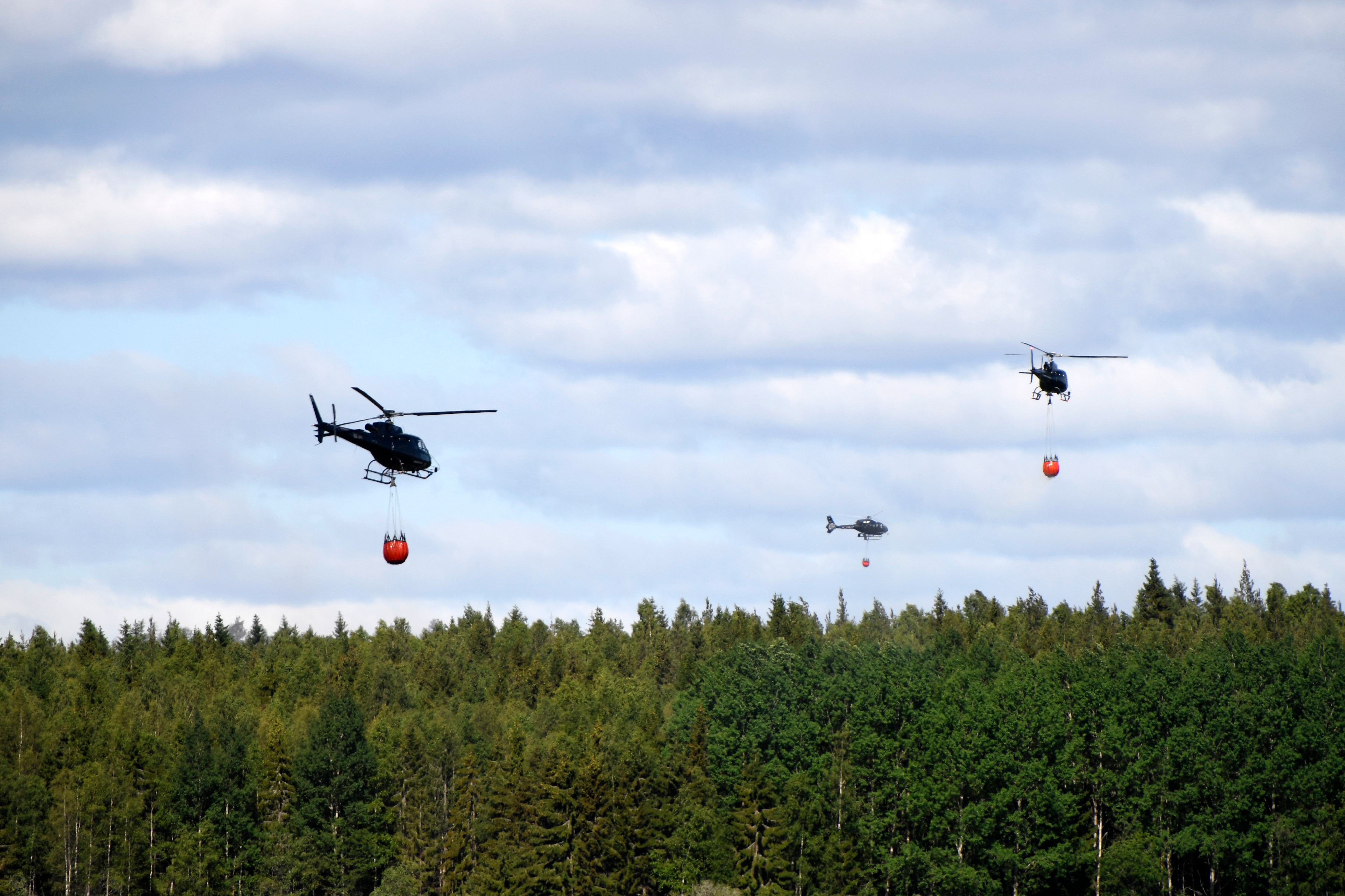 Fem helikoptere, 60 hjemmeværnssoldater og utallige brandmænd er sat ind i kampen mod en skovbrand nær Sala i det sydlige Sverige.