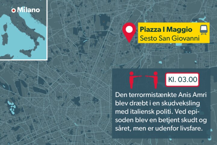 Den 24-årige tuneser Anis Amiri er blevet dræbt i en skudveksling med politiet. Det skulle være sket, da den mistænkte mand i nat trak en pistol under en rutinemæssig politikontrol på pladsen foran togstationen Sesto San Giovanni.