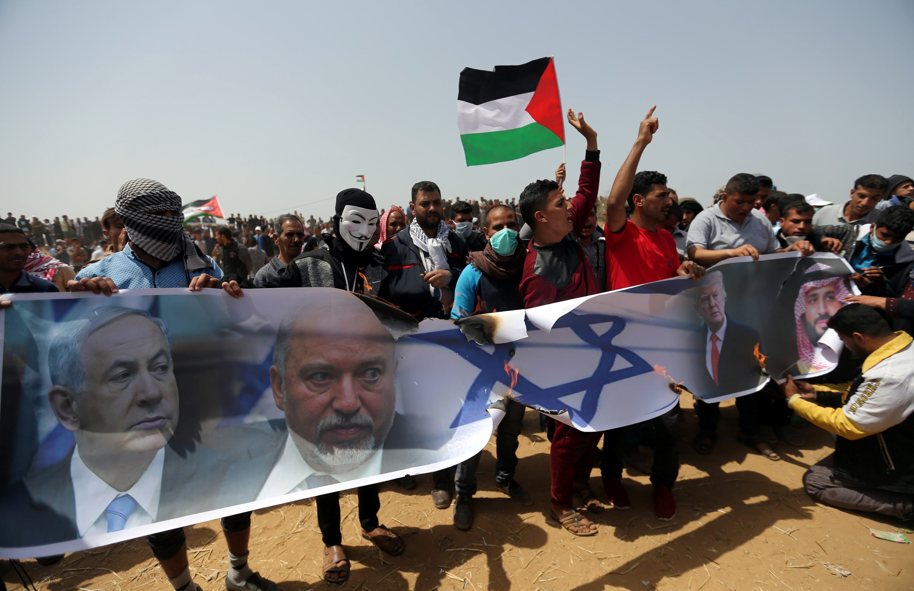 Dertil kommer røgen fra de israelske flag, som bliver brændt sammen med fotos af Israels premierminister, Benjamin Netanyahu, USA's præsident, Donald Trump, og den saudiarabiske kronprins, Mohammed bin Salman, som demonstranterne siger, samarbejder med israelerne.