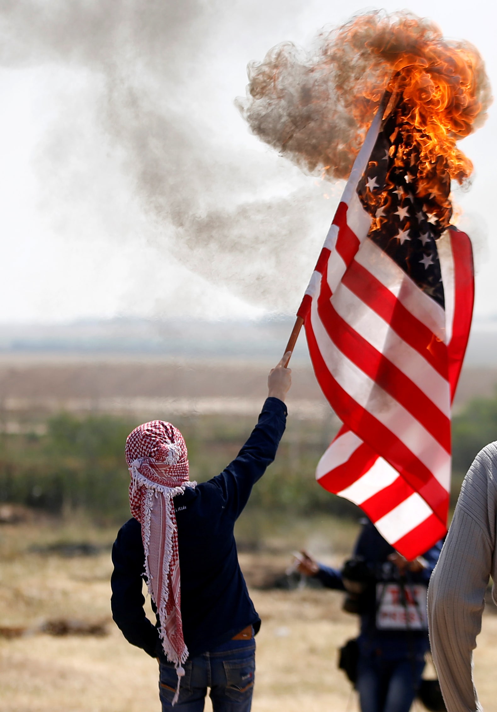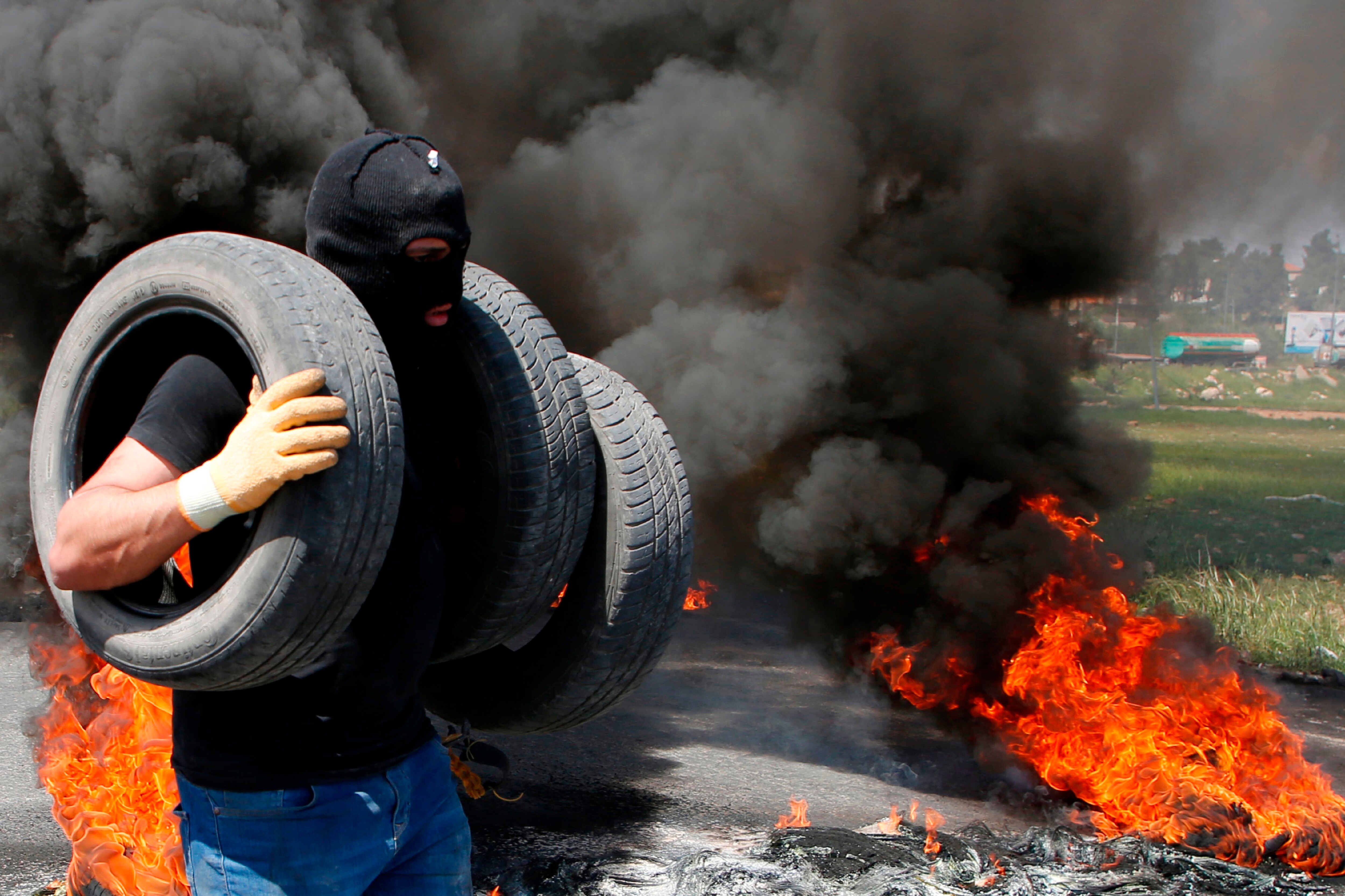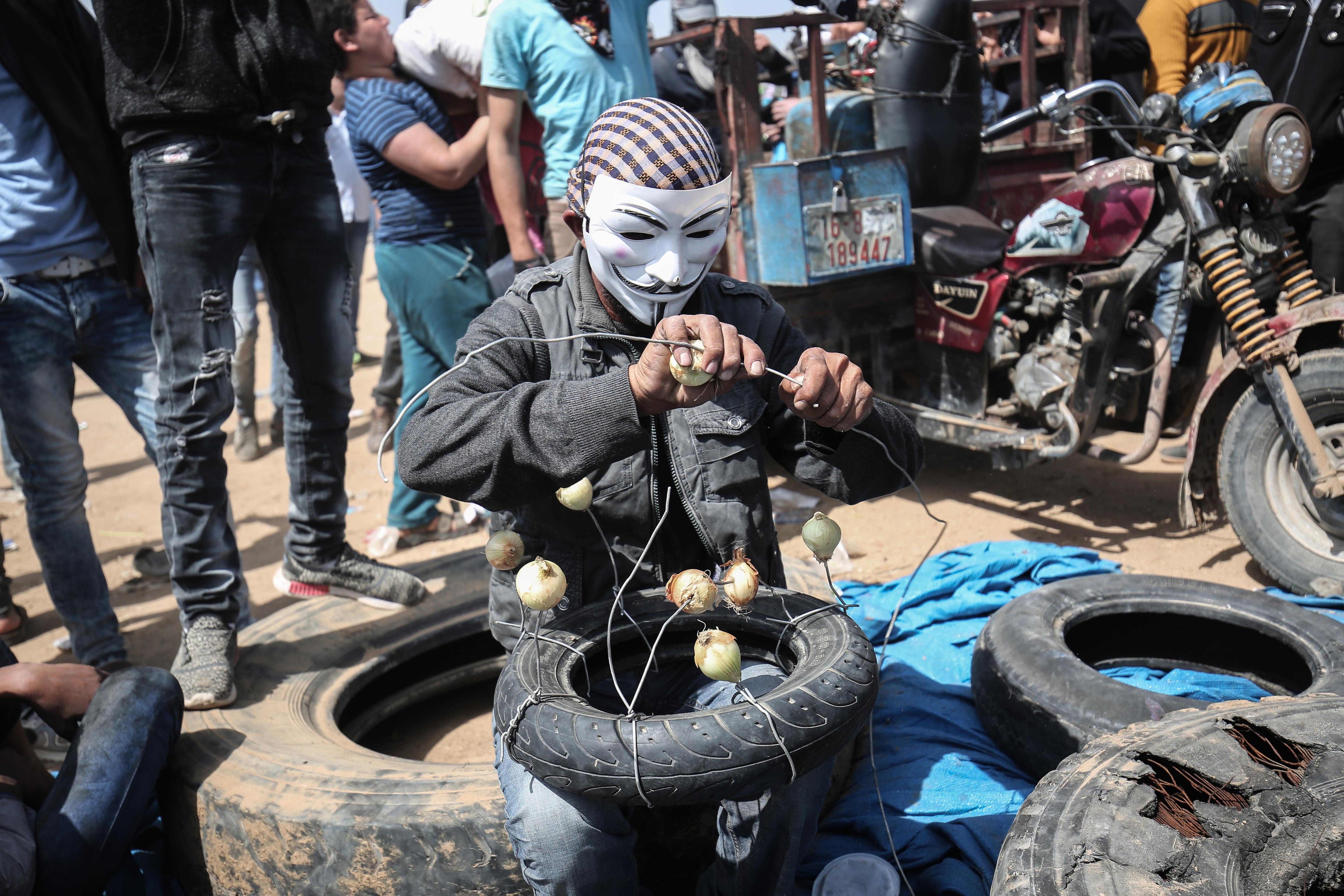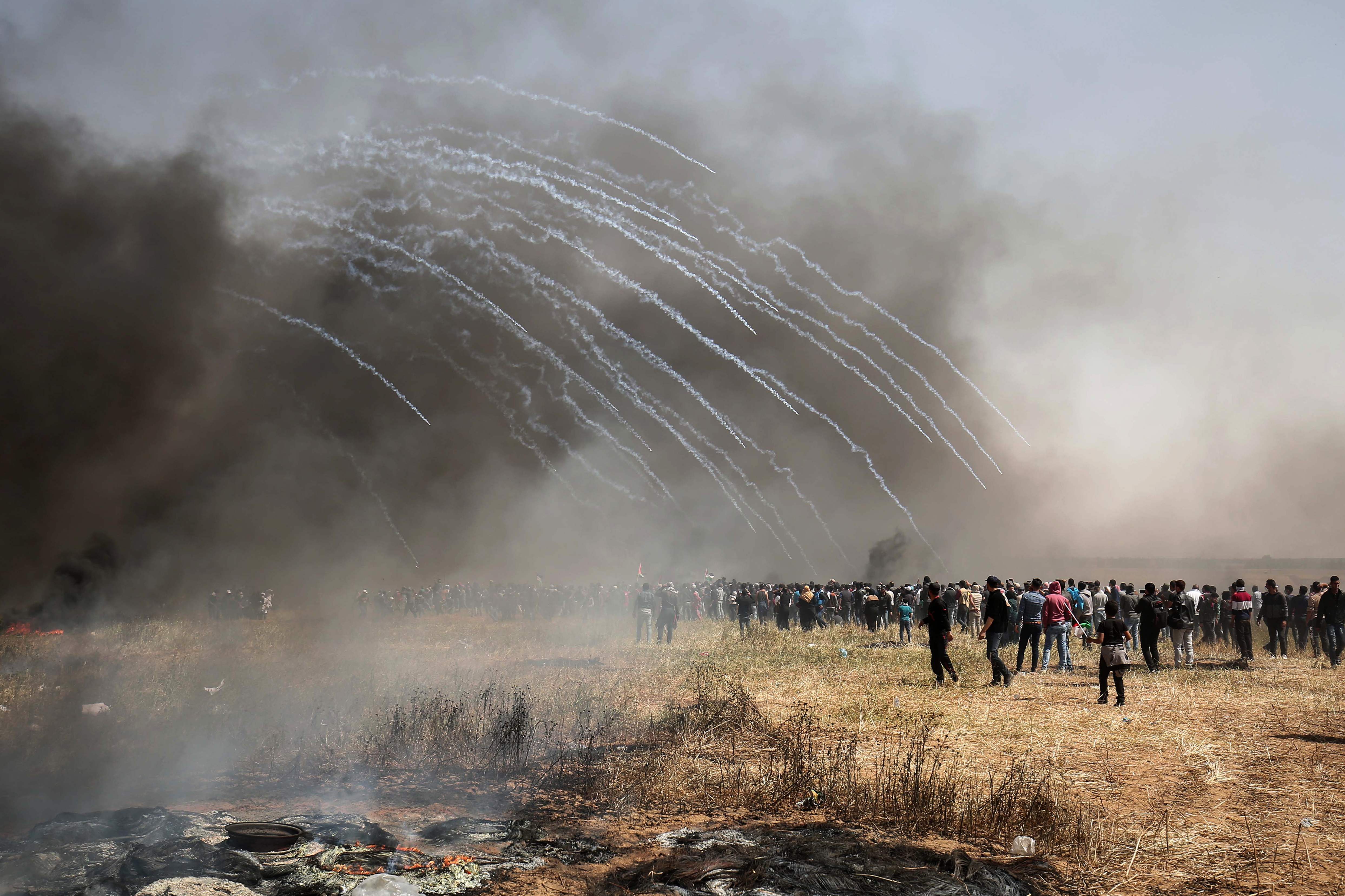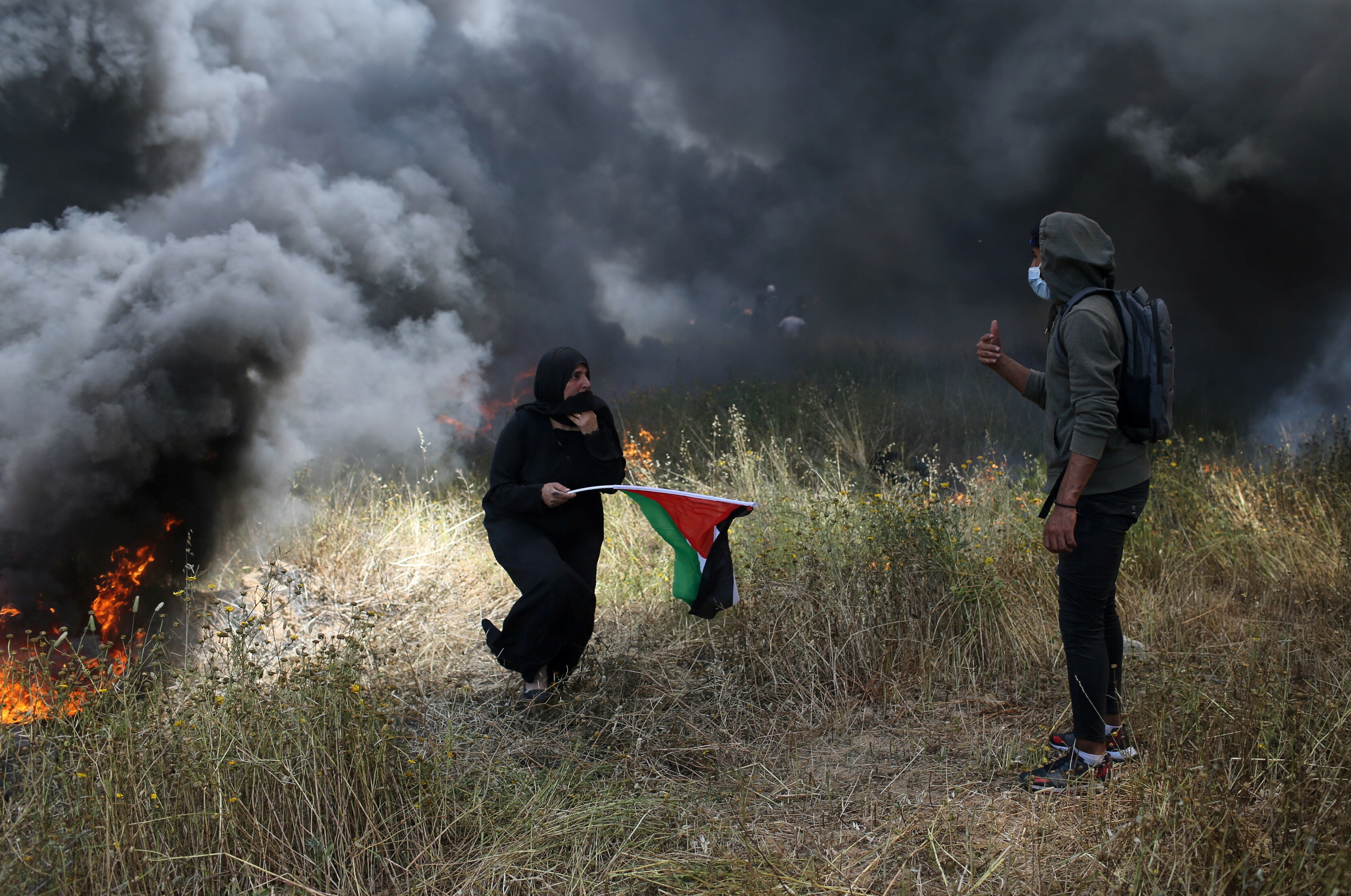 For at beskytte sig sætter de palæstinensiske demonstranter ild til store bunker af bildæk, som skaber massive sorte røgskyer, der skal fungere som camouflage mod de israelske sikkerhedsstyrker, der har svaret igen ved brug af vandkanoner og tåregas.
