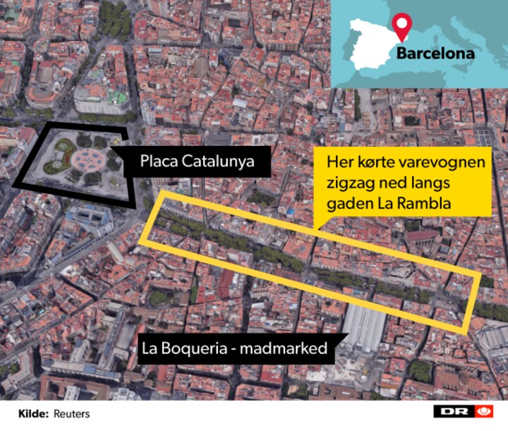 Cirka klokken 17.20 torsdag kørte en hvid varevogn ned igennem Barcelona-gågaden La Rambla, der er kendt for at tiltrække mange turister. Angrebet startede ved Plaça Catalunya, som La Rambla udspringer fra.