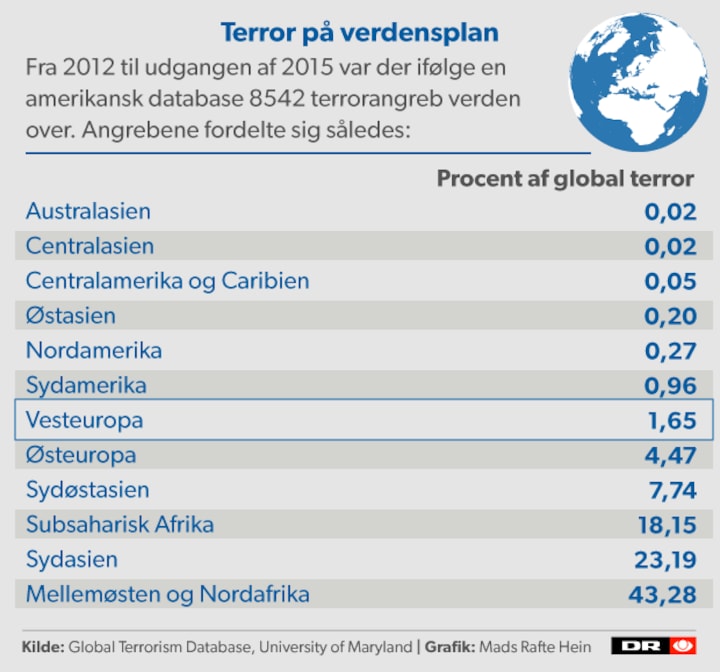 - Det er stadig lande som Pakistan, Irak og Syrien, der i det store billede er mest plaget af terrorisme, og det er i et helt andet omfang, end hvad vi kender i Europa.