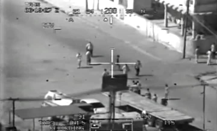 I en video filmet fra en amerikansk helikopter ser vi, hvordan amerikanske styrker skyder på en gruppe mennesker, der samler sig ved vejsiden i det østlige Bagdad.