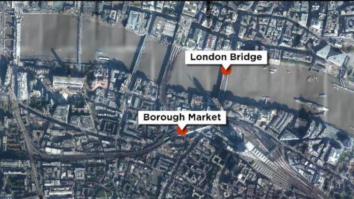 En hvid varevogn påkørte i høj fart fodgængere på London Bridge i den britiske hovedstad, før tre gerningsmand steg ud af varevognen og overfaldt tilfældige personer med knive.