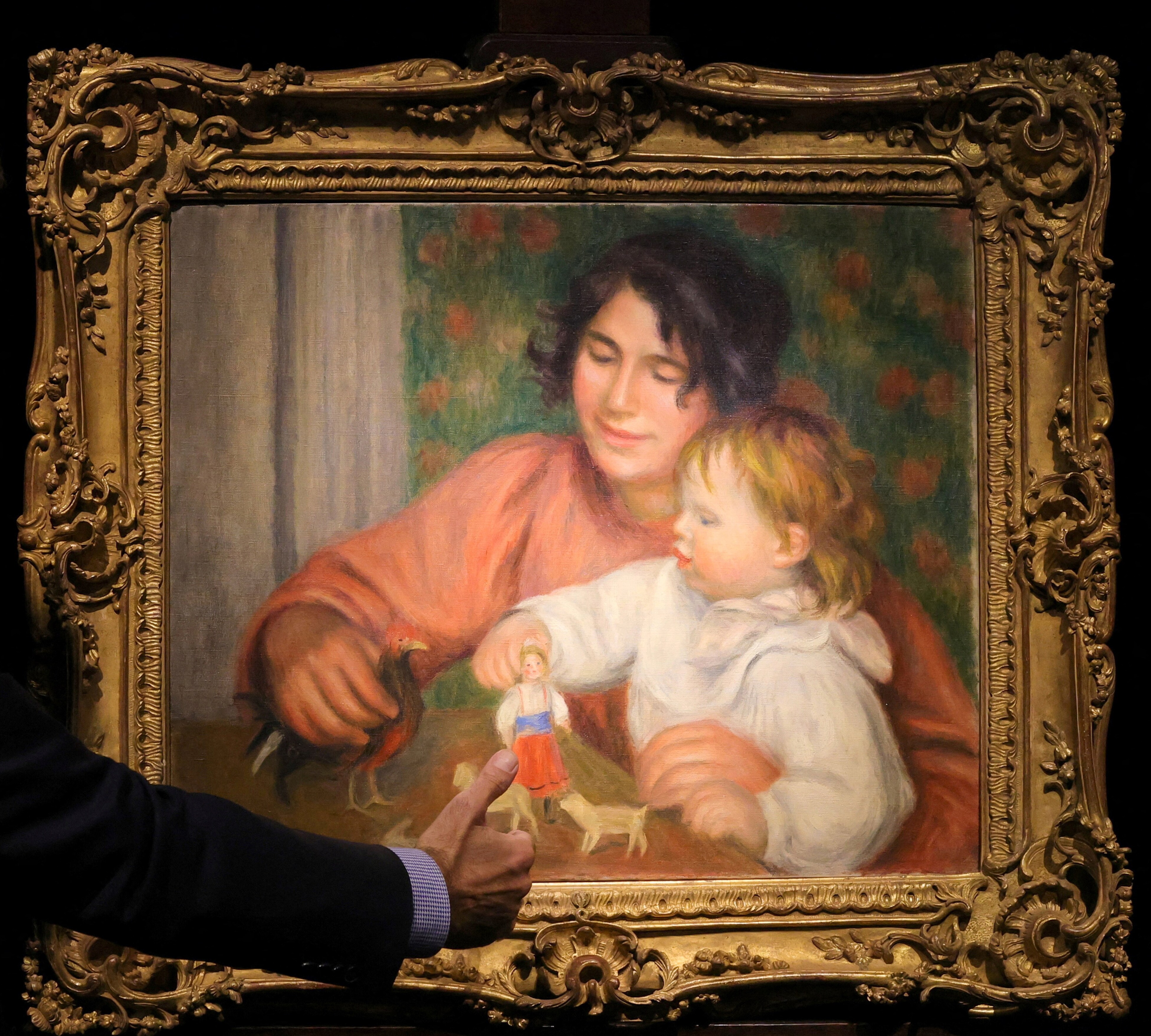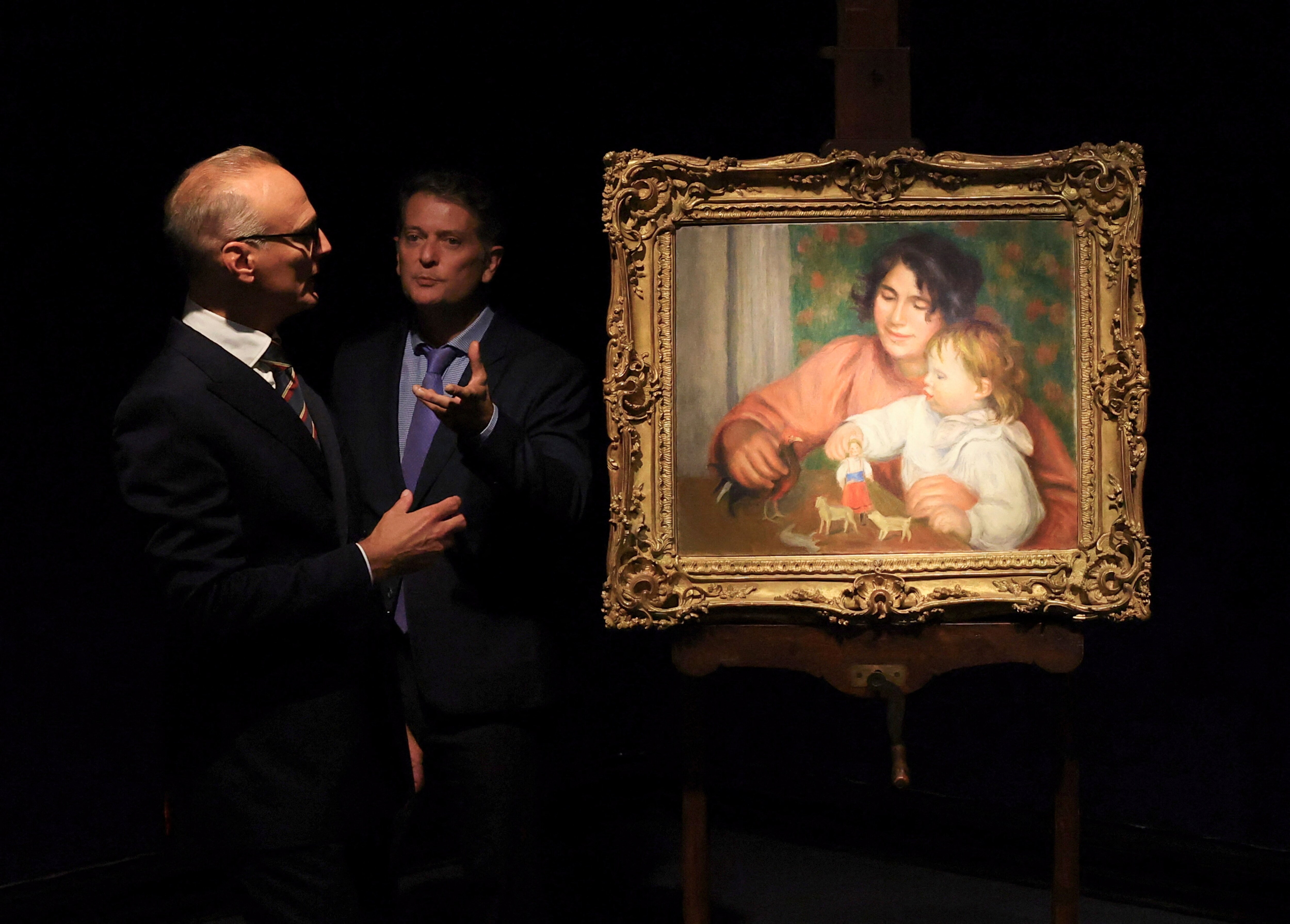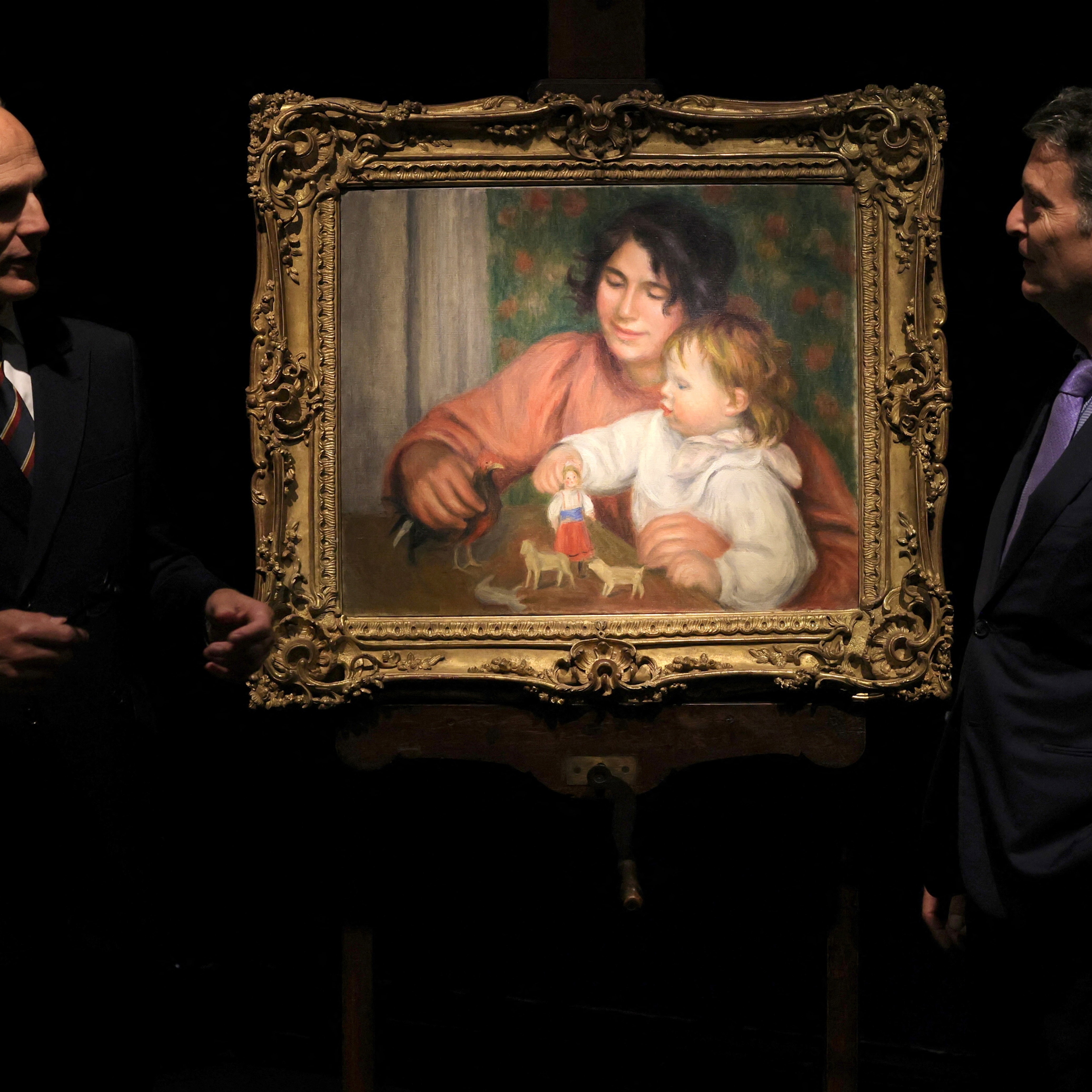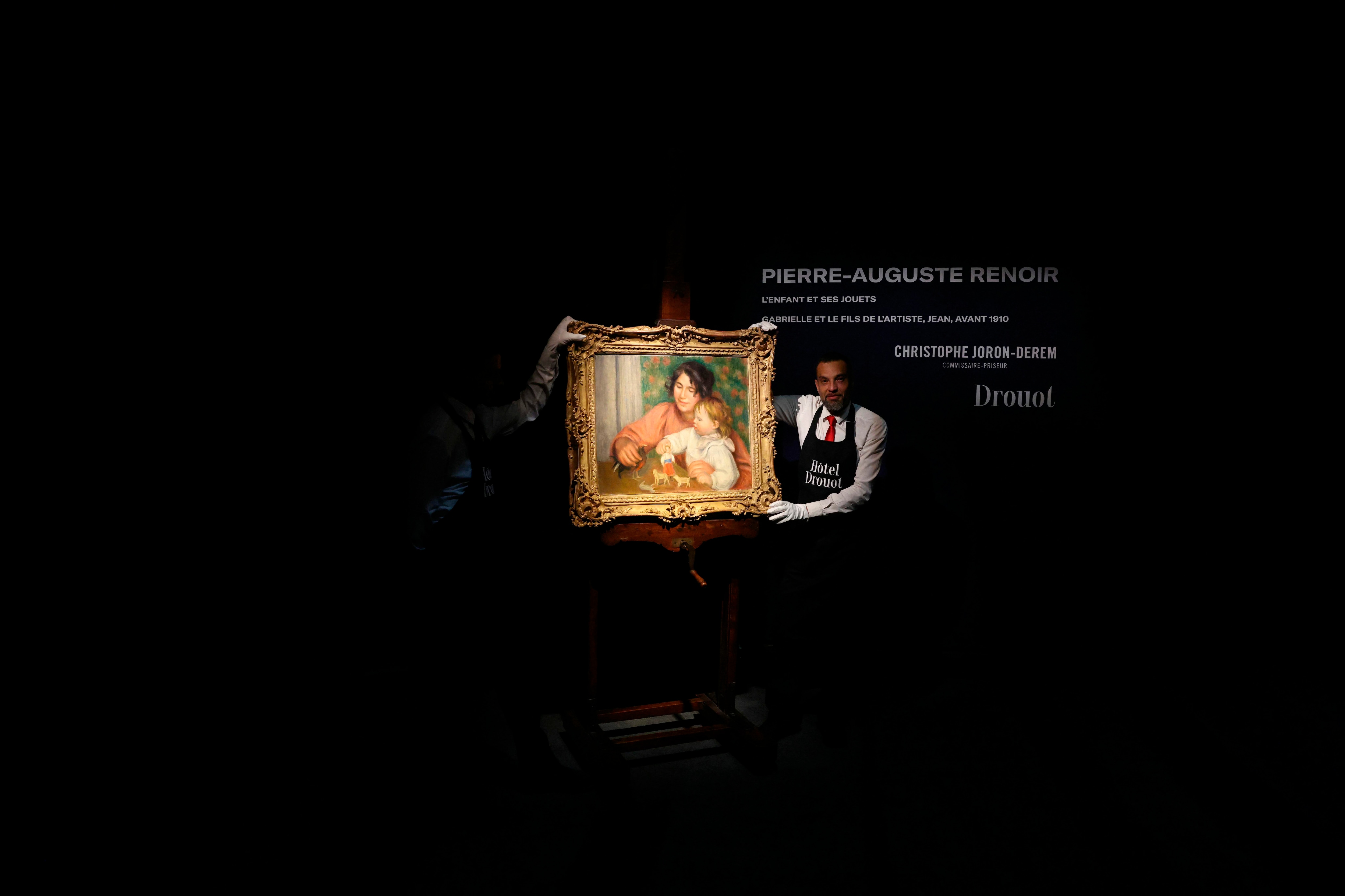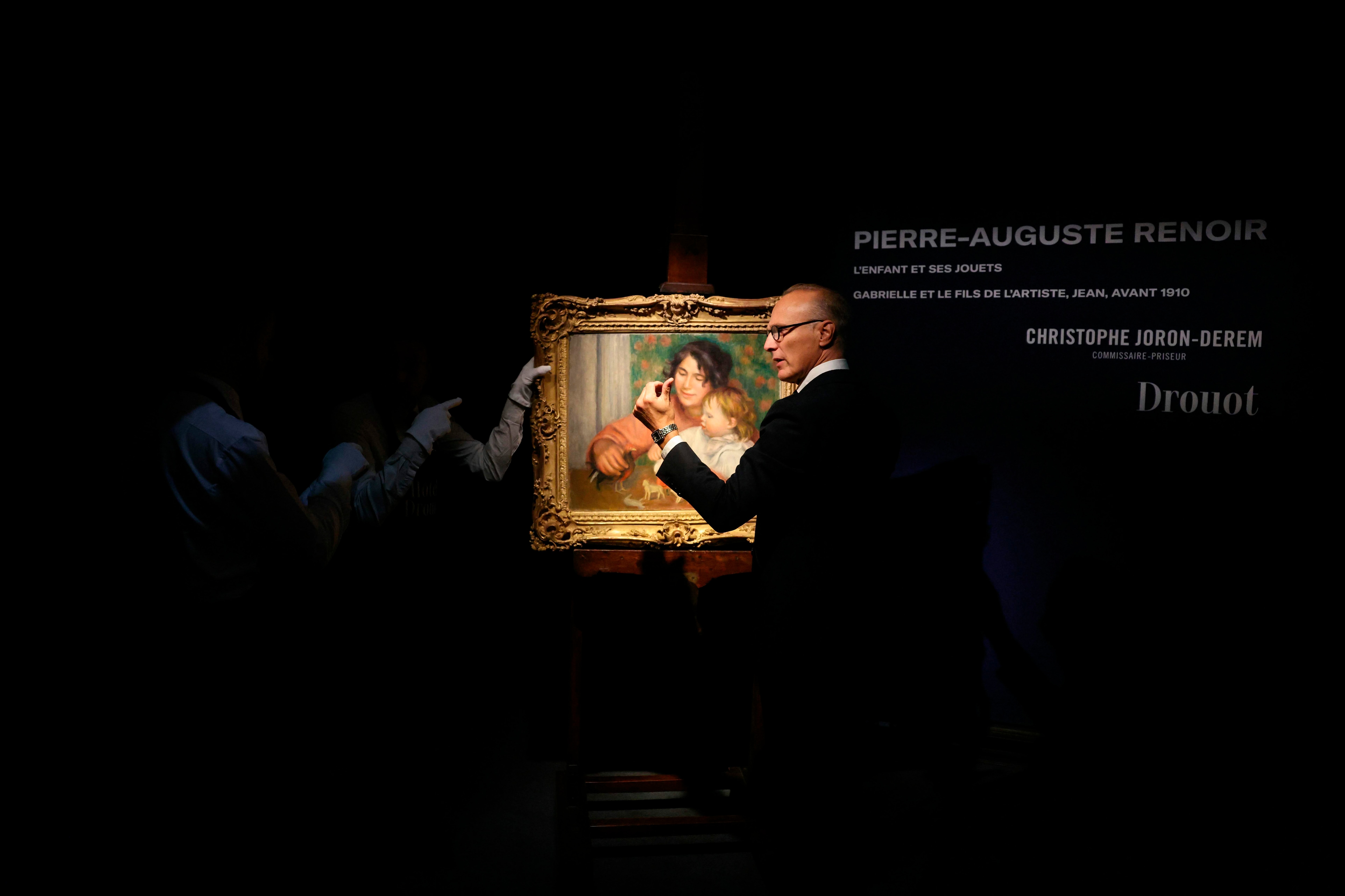 Lærkes tekst (Foto: © Fotograf Lærke ) Lærkes billedtekst (Foto: © Yves Herman, Reuters/Ritzau Scanpix) TOPSHOT - This photograph shows an exclusive presentation of an oil painting on canvas (Before 1910) entitled The Child and his Toys - Gabrielle and the artists sun Jean -, a major piece of art by Pierre-Auguste Renoir 1841-1919) displayed at Drouot auction house in Paris, on October 16, 2025. (Photo by Alain JOCARD / AFP) (Foto: © Alain Jocard, AFP/Ritzau Scanpix) Auctioneer Christophe Joron-Derem and Art consultant Pascal Perrin stand next to the painting "Lenfant et ses jouets - Gabrielle et le fils de lartiste, Jean" (Child with Toys - Gabrielle and the Artists Son, Jean), before 1910, by artist Pierre-Auguste Renoir (1841-1919) on display before its auction at Drouot auction house in Paris, France, October 14, 2025. REUTERS/Yves Herman (Foto: © Yves Herman, Reuters/Ritzau Scanpix) This photograph shows an exclusive presentation of an oil painting on canvas (Before 1910) entitled The Child and his Toys - Gabrielle and the artists sun Jean -, a major piece of art by Pierre-Auguste Renoir 1841-1919) displayed at Drouot auction house in Paris, on October 16, 2025. (Photo by Alain JOCARD / AFP) (Foto: © Alain Jocard, AFP/Ritzau Scanpix) Auctionner Christophe Joron-Derem presents an oil painting on canvas (Before 1910) entitled The Child and his Toys - Gabrielle and the artists sun Jean -, a major piece of art by Pierre-Auguste Renoir 1841-1919) displayed at Drouot auction house in Paris, on October 16, 2025. (Photo by Alain JOCARD / AFP) (Foto: © Alain Jocard, AFP/Ritzau Scanpix) Art consultant Pascal Perrin stands next to the painting "Lenfant et ses jouets - Gabrielle et le fils de lartiste, Jean" (Child with Toys - Gabrielle and the Artists Son, Jean), before 1910, by artist Pierre-Auguste Renoir (1841-1919) on display before its auction at Drouot auction house in Paris, France, October 14, 2025. REUTERS/Yves Herman (Foto: © Yves Herman, Reuters/Ritzau Scanpix)