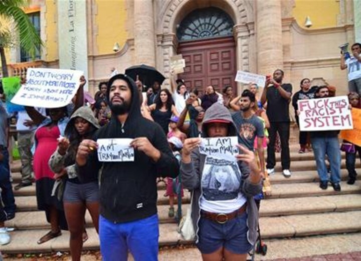 Gruppen, der primært bestod af sorte amerikanere, råbte i kor, og nogle stod med skilte påtrykt Vi er alle Trayvon og et lød: Sæt racistiske mordere i fængsel, ikke unge sorte.