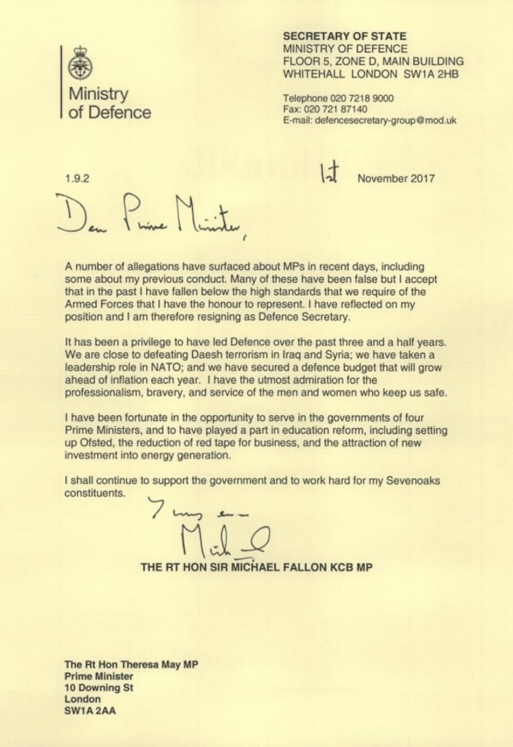 Michael Fallons afgang kommer ligeledes, efter at der er kommet massivt fokus på de seksuelle krænkelser, der angiveligt skulle være udført af ministre og parlamentsmedlemmer.