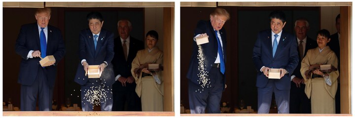 6. Tv-stationen CNN bragte et klip, der viste Trump overfodre fisk under et møde med den japanske premierminister Shinzo Abe.