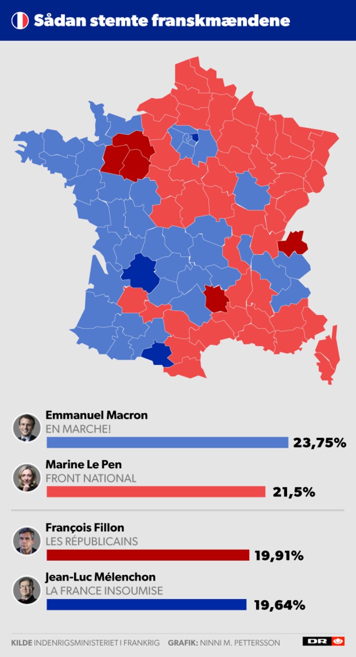 Valgets vinder blev Emmanuel Macron, der med sin blot et år gamle bevægelse 'En Marche!' fik 23,8 procent af stemmerne.