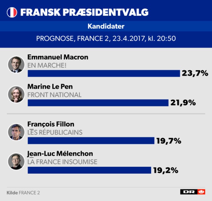 Centrum-kandidaten Emmanuel Macron står i skrivende stund til at tage den anden af de to pladser ved anden og sidste runde i præsidentvalgkampen. Den løber af stablen den 7.maj.