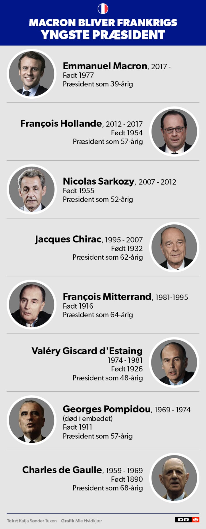 - De næste fem år skal jeg repræsentere jer, sagde han og henvendte sig direkte til de franskmænd, som har stemt på ham i dag for at undgå, at modkandidaten, Marine Le Pen, blev valgt.
