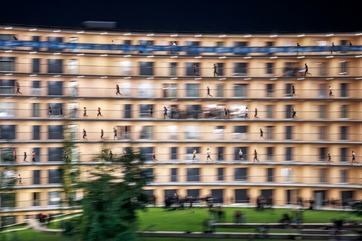 TOPSHOT - Competitors take part in the Vortex race near Lausanne, on October 16, 2025. Around 2, 000 participants, mostly students take part in this unique race created in 2021 by a group of students, involving running up the 2.8 km helicoidal passageway of the Vortex, an iconic eight floor circular building of the campus of the University of Lausanne. (Photo by Fabrice COFFRINI / AFP) (Foto: © Fabrice Coffrini, AFP/Ritzau Scanpix)