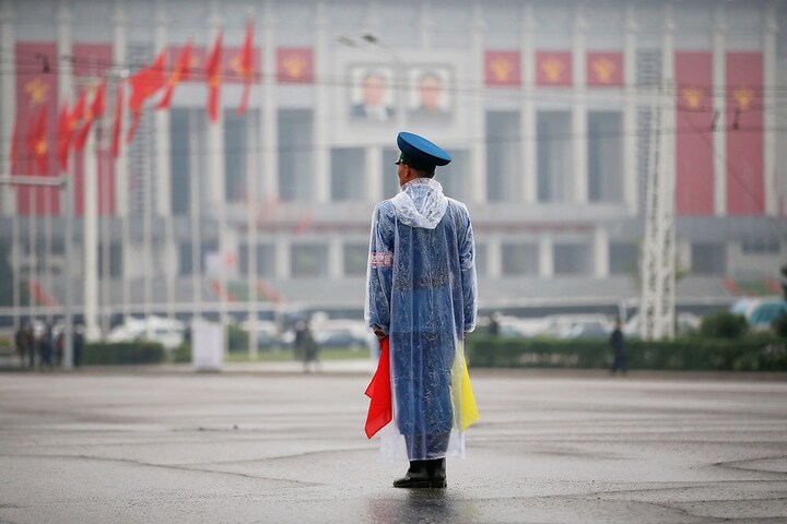 Rundt om hele bygningen står mænd fuldstændig stille - alle med paraplyer - og det skal være Kim Jong-uns personlige garde.