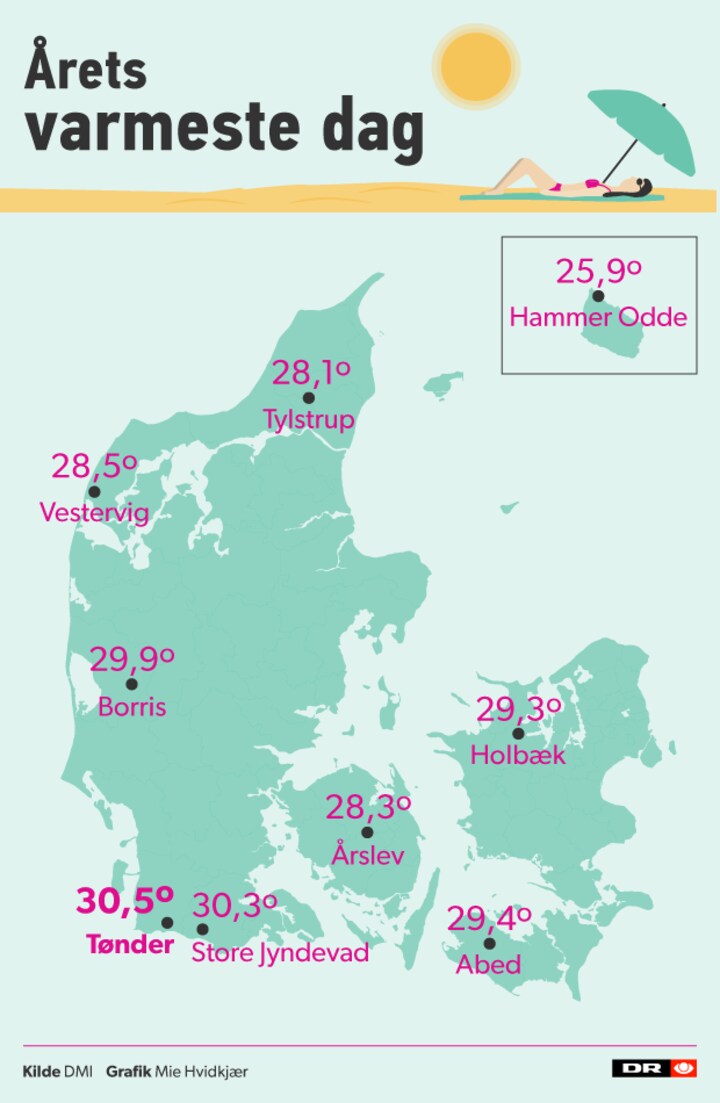 Tønder i Sønderjylland nappede rekorden ved at have den højeste temperatur i år med 30,5 grader, der blev målt på DMI's målestation.