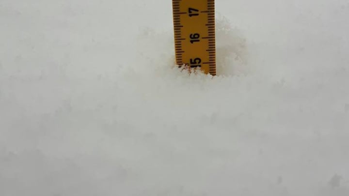 Herunder er det Claus Johansen fra Herslev ved Fredericia, der med en målestok har markeret en snedybde på knap 15 centimeter.