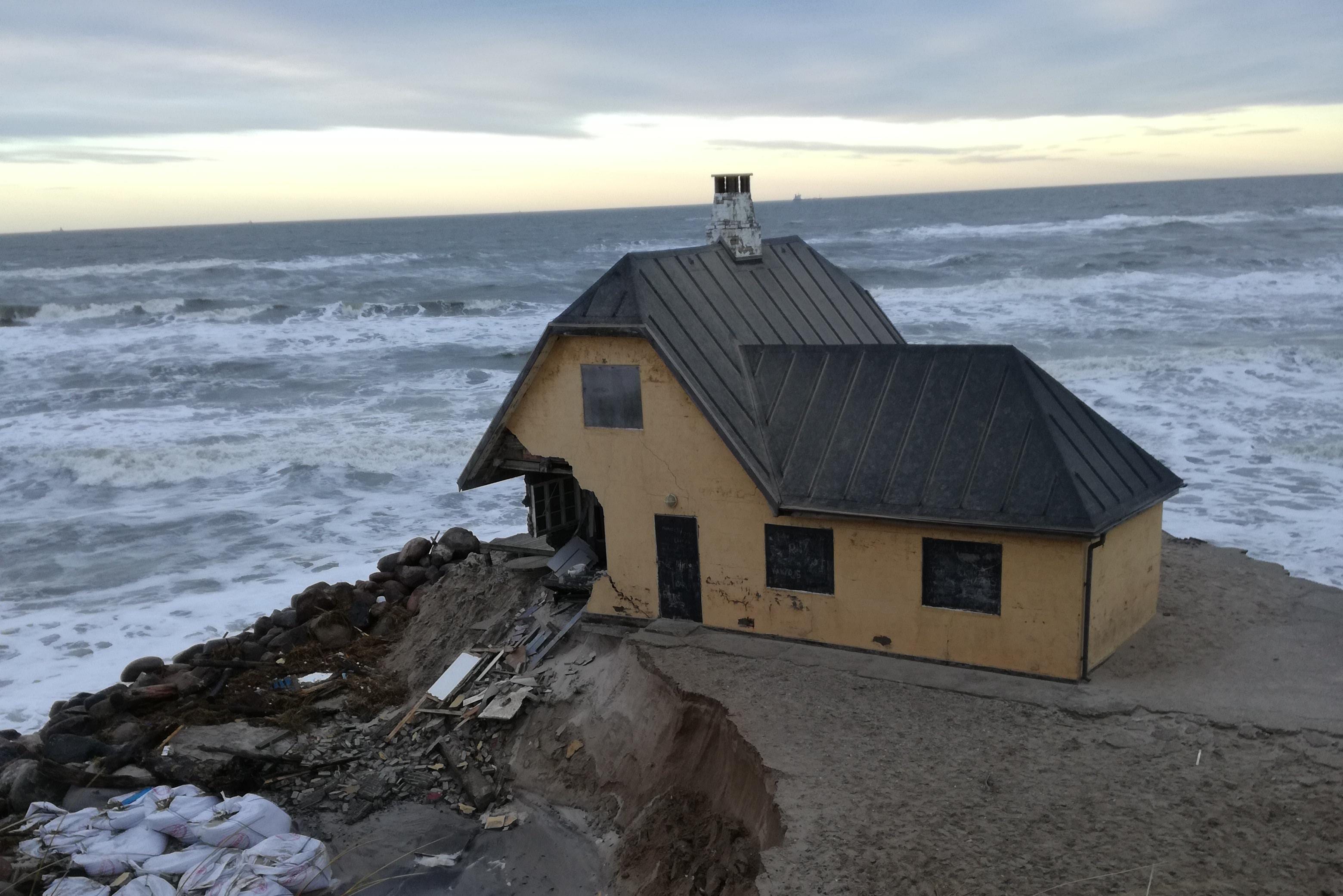 Sommerhus ved Uggerby strand mellem Hirtshals og Skagen har hidtil ligget beskyttet af klitter, men de er nu er blevet skyllet væk. (Foto: © Helge Paulsen, brugerbilleder)