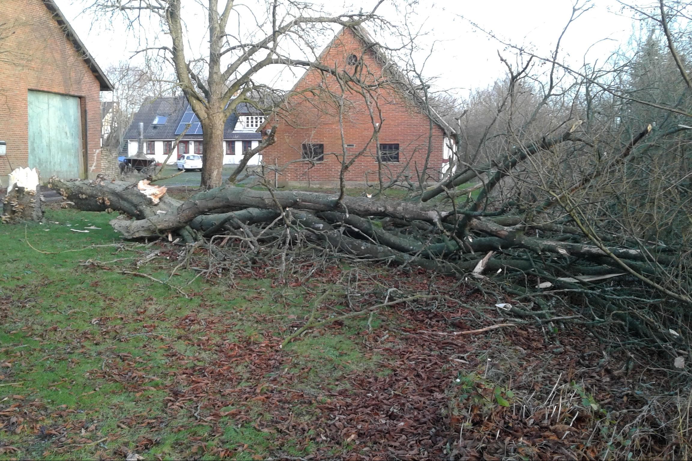 I Børkop var Lars heldig at træet her faldt i den rigtige retning og dermed skånede huset for skader. (Foto: © Lars Sommer, brugerbilleder)