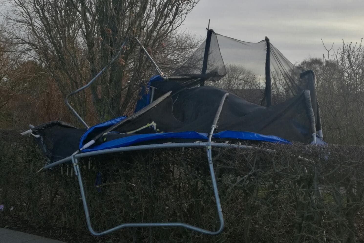 I Anita's have i Frederikshavn fløj trampolinen sig en tur og landede i busken her. (Foto: © Anita Abildgaard, brugerbilleder)