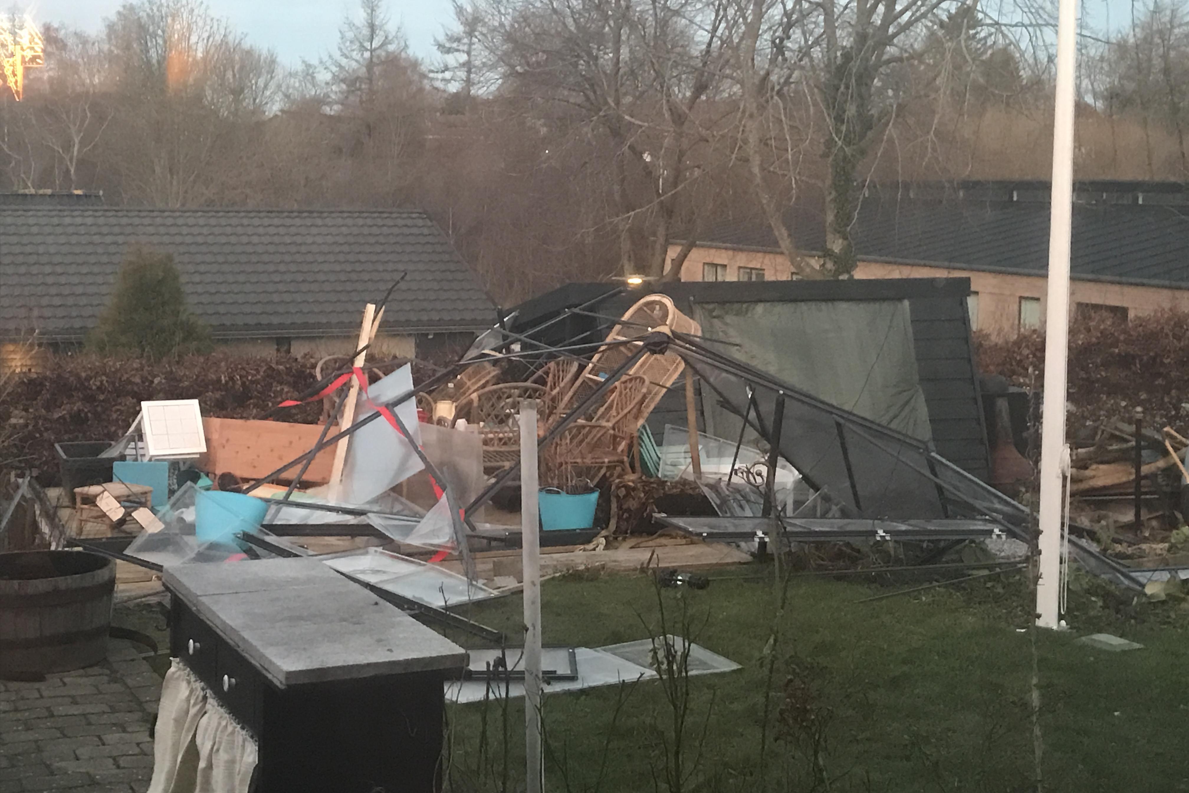 I Hjørring blev drivhuset her totalsmadret efter stormen Urd ramte. Særligt i Nordjylland var stormen kraftig. (Foto: © Heidi Cecilie Terp Rasmussen, brugerbilleder)