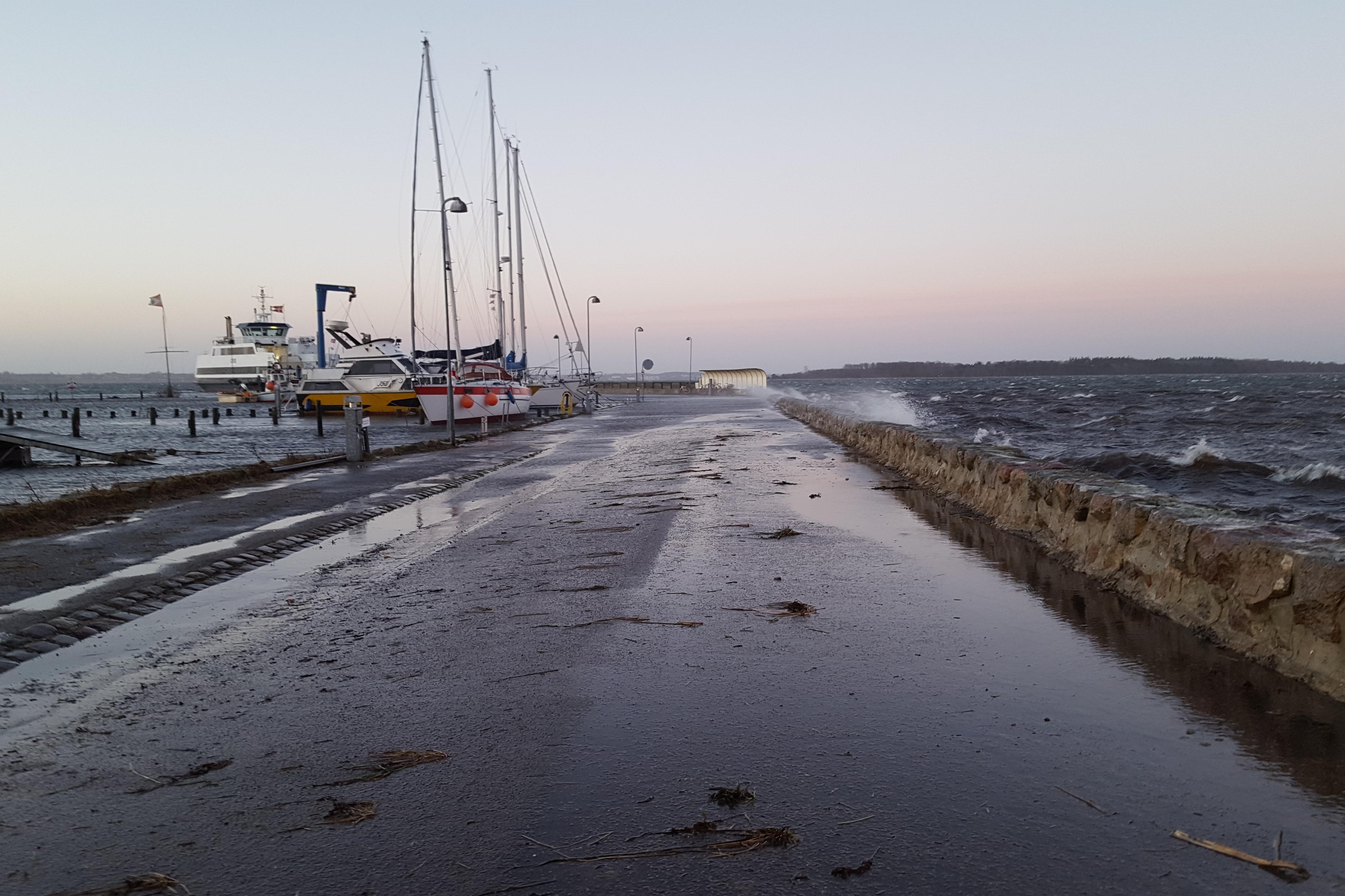 Havnen på Orø blev oversvømmet som resultat af Urd's hærgen. (Foto: © Steen Parkel, brugerbilleder)