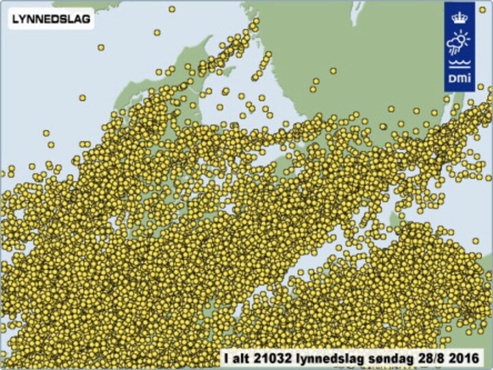 Danmark er dækket af lyn fra søndagens uvejr. Det blev til over 20.000 lyn. (© DR)