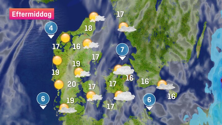Vinden, som kommer fra nord, kommer vi ikke til at mærke så meget til. Den vil være svag til jævn og op til frisk i de østlige egne af Danmark.