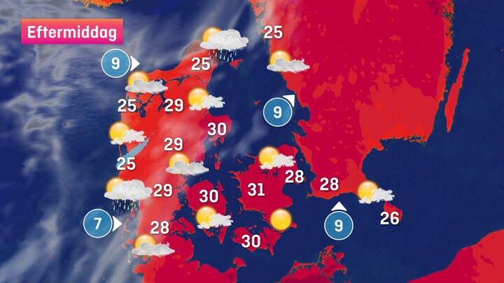 De vestlige egne får det lidt køligere med 23-25 grader, når skyer trækker ind fra vest og dæmper varmen en smule.