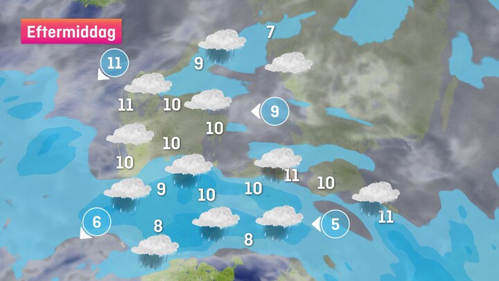 Regnen starter centralt i landet over Fyn, Østjylland og Vestsjælland, og i løbet af dagen vil det sprede sig til resten af Sjælland, Bornholm og især Syd-, Midt- og Vestjylland. Der, hvor regnen ikke falder, vil der alligevel være risiko for regnbyger af og til.