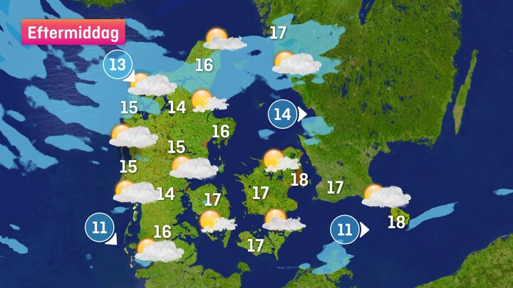 Den laveste temperatur i morges var 7,9 grader i Skrydstrup. Dagens opvarmning får næppe temperaturen højere end 15 til 18 grader, og det bliver varmest i de østlige egne.