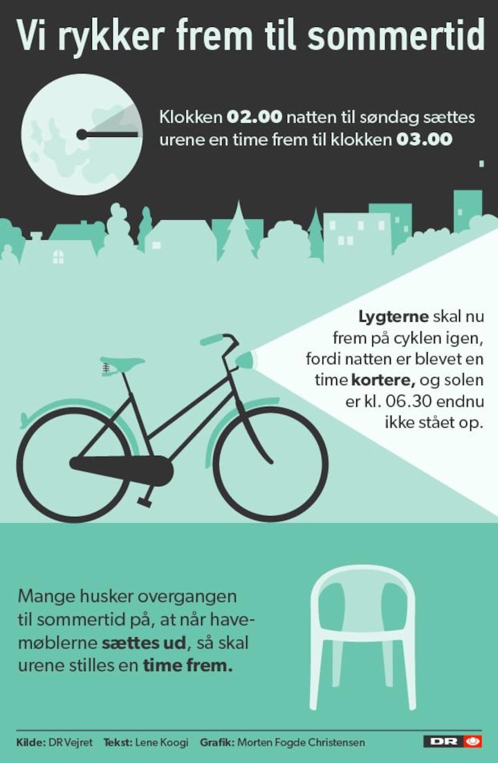 I denne weekend rykker vi frem til sommertid. Mere præcist skal uret klokken 02.00 natten til søndag sættes en time frem til klokken 03.00.