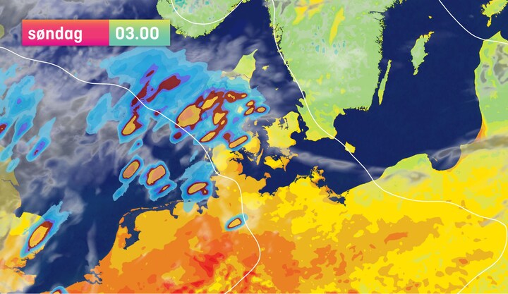 Det trækker op over Jylland frem til søndag morgen og om formiddagen videre østpå til Sjælland. Senere på dagen kommer endnu en bølge af regn- og tordenbyger op over landet, men her vil det være den sydlige halvdel af landet, som er mest udsat.