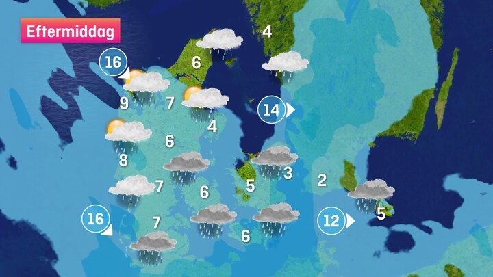 I de tidlige formiddagstimer endnu enkelte slud- eller snebyger, men regn og regnbyger trækker ind over Jylland i formiddag. Samtidig tiltager vinden til hård vind til kuling og temperaturen stiger til omkring 5 graders varme.