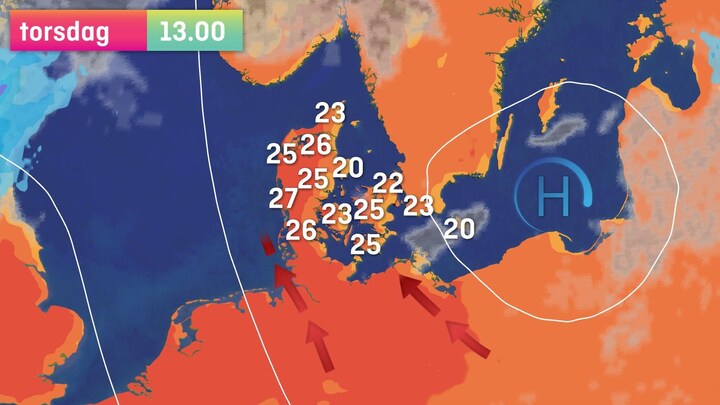 Varmen vil i så fald være størst i vestlige landsdele mens de østlige kyster bliver mere svale da varmen også kommer med en opfriskende vind fra sydøst.