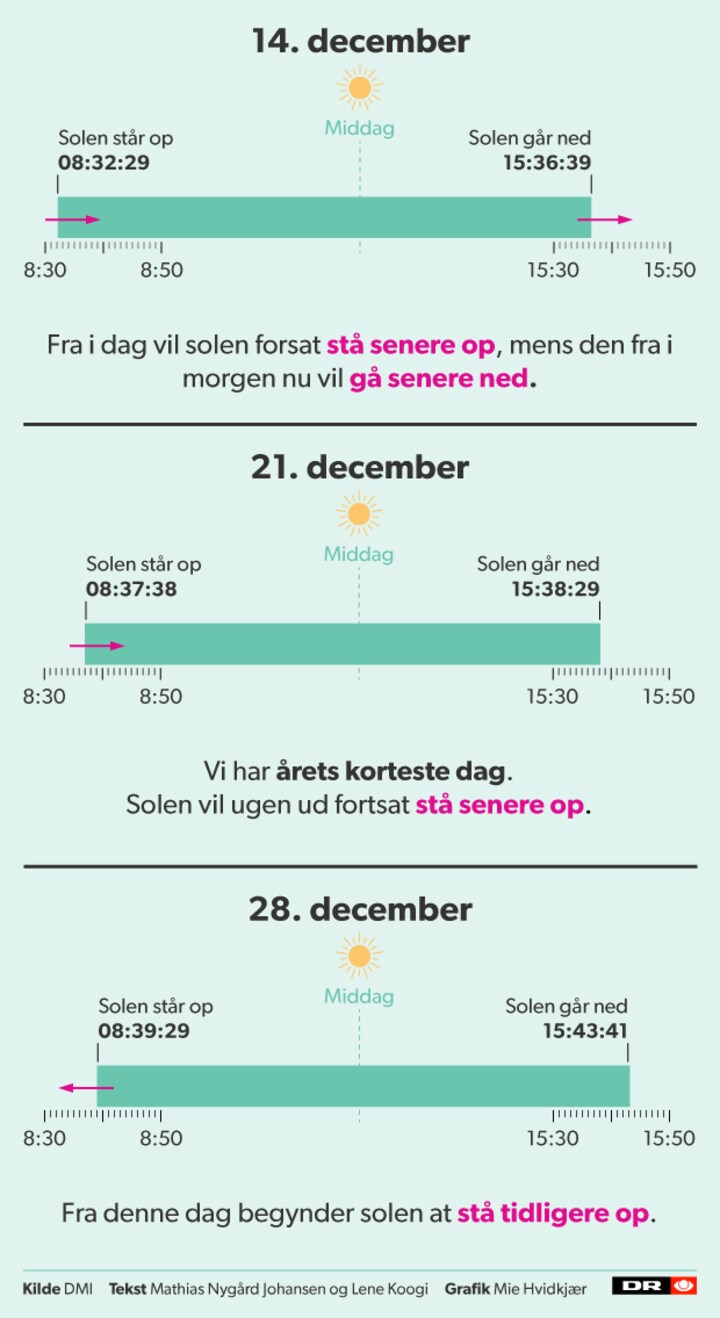 Vintersolhvervet den 21. december er årets korteste dag. Her opnår vi altså det absolutte minimum mellem, hvornår solen står op, og solen går ned.