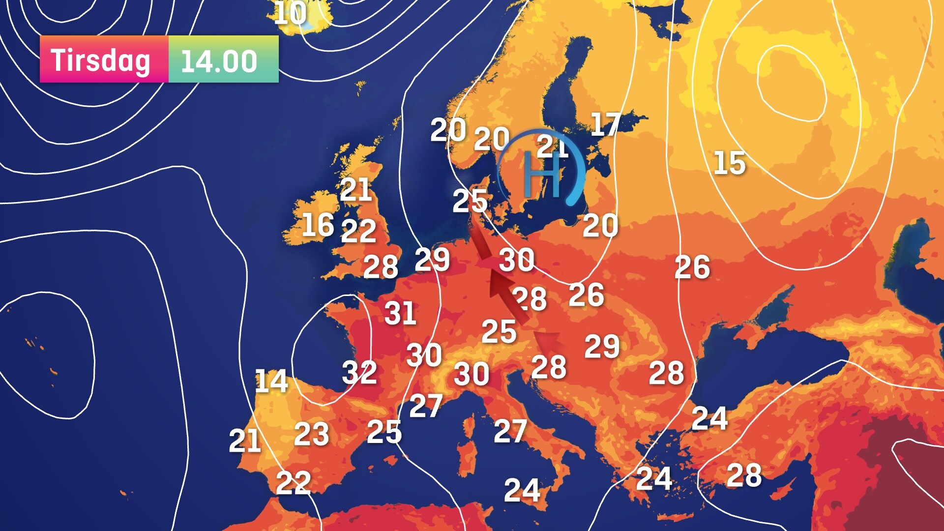 Højtrykket sender en solid sydeuropæisk varme op over os fra syd- og sydøst. Derfor ventes temperaturen at nå uanede højder, faktisk så højt som helt op til 27-28 grader på tirsdag, hvor varmen kulminerer.