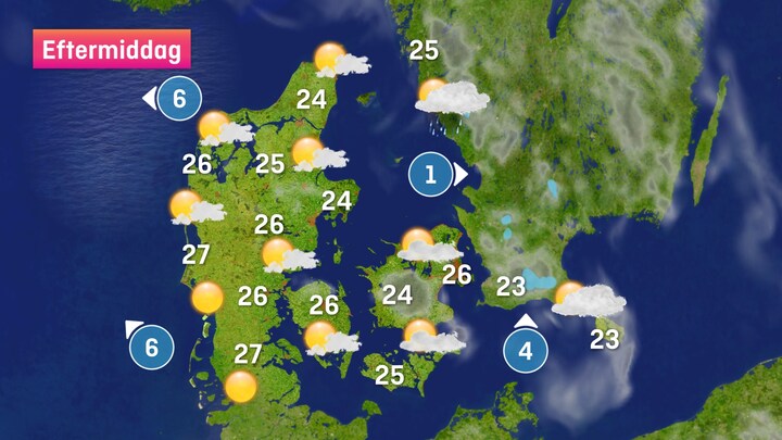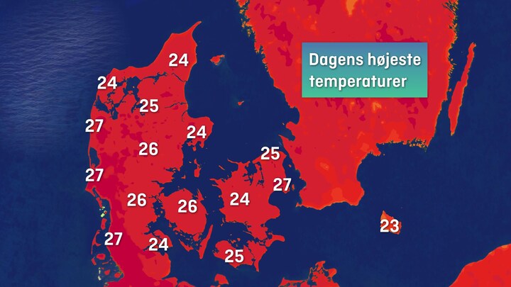 Termometret når mellem 20 og 25 grader, lokalt op til 27 grader. Her er det jyderne langs vestkysten, der kan få op til 27 grader. Varmen kan i eftermiddag få følgeskab af lokale regnbyger.